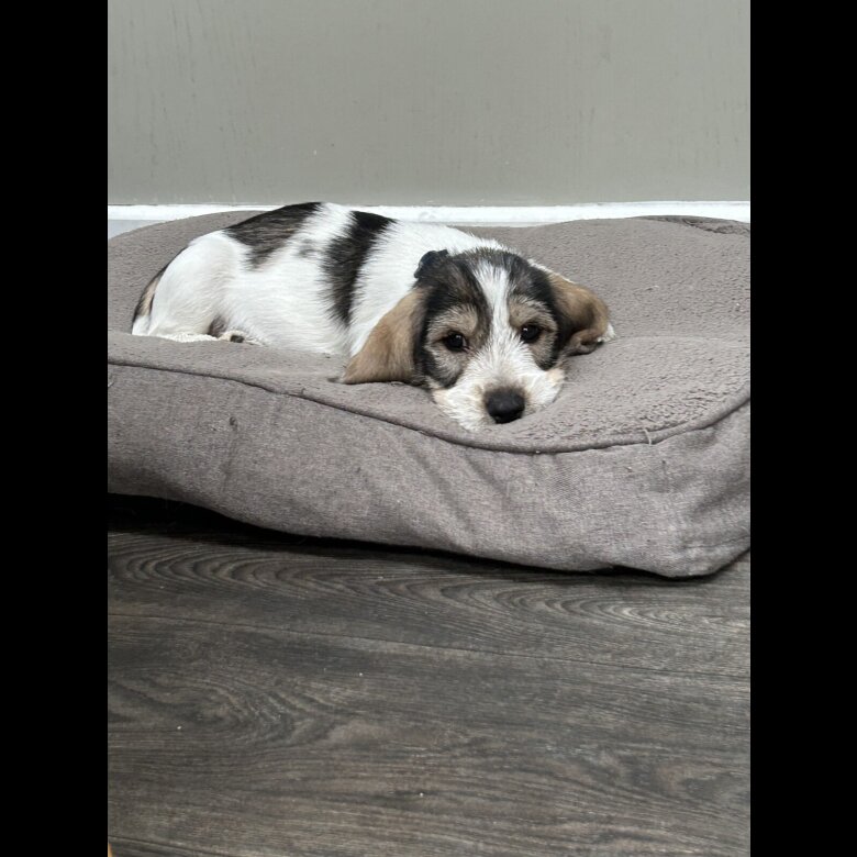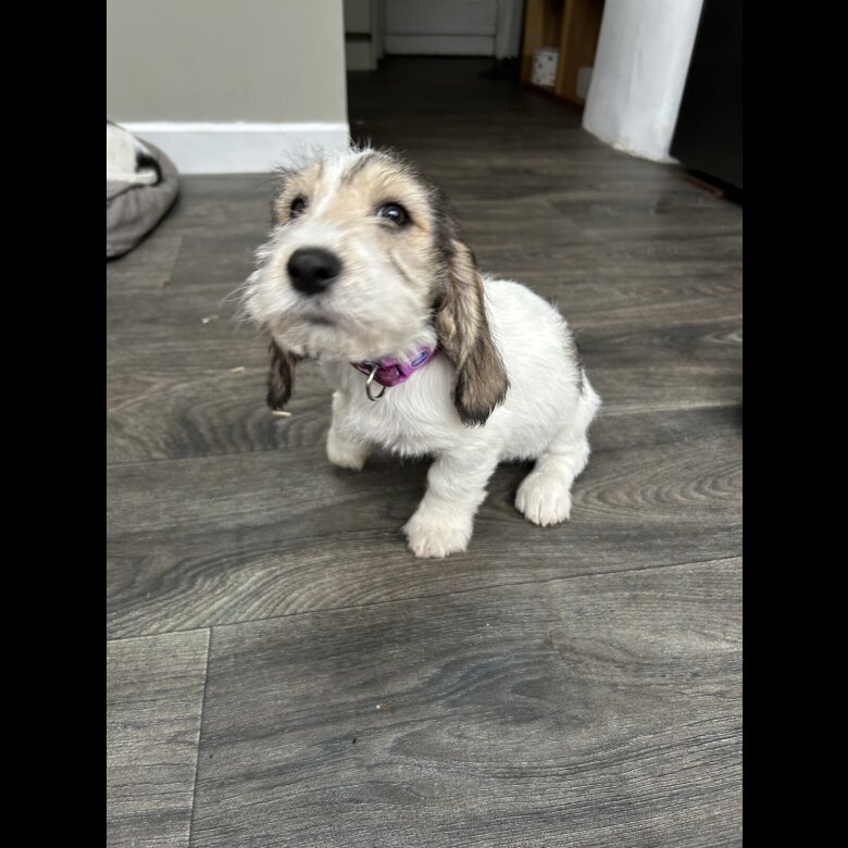 Griffon Petit Basset Vendeen Tricolour. These are pure bred L.O.F. (French equivalent of Kennel Club) rare breed PBGV puppies available. Mother and father both owned by us, from the Vendeen region in France. Calm, affectionate and friendly. Good with children and other dogs. Can require firm training as hunting instincts. Do your research on the breed please. The parents have lovely gentle characters; this breed makes excellent companion, therapy or emotional support dog.