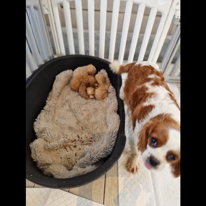 Our 2 and a half year old beautiful Blenheim Cavalier king charles girl Has given birth to her first litter of 5 marbled cavapoo babies!