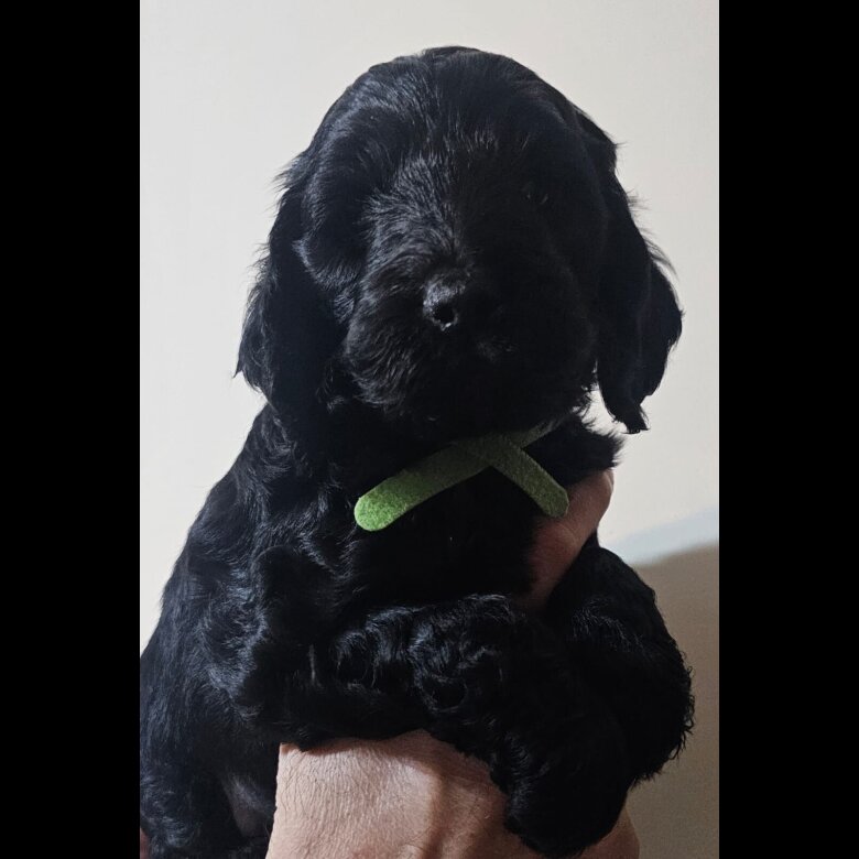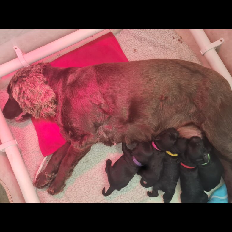 Mavis our gorgeous chocolate working type cocker girl has given birth to 5 gorgeous bouncy black F1 cockapoo puppies (2boys, 3girls) on 27/10/25 and they will be ready to leave on/after 22/12/25. Mavis is bred from working type spaniels although she hasn’t been worked herself and enjoys life as our sofa sloth alongside our other two indoor dogs. Mavis has been DNA tested with clear results for PRA / FN and AMS as suggested by the kennel club. Dad is a gorgeous KC registered apricot miniature poodle who is intensively DNA tested for all poodle related hereditary diseases ensuring all of his offspring will at least be ‘hereditary unaffected’ by any of these diseases. The mix between both of these wonderful dogs have resulted in our exceptionally healthy and happy puppies. Our puppies have been born and raised inside our home around all household noises and our other two resident dogs so will be very well socialised with both people and other dogs. Mavis has been a very affectionate and attentive mum and slowly her babies have been introduced to hard feed which they will be leaving for their new homes with to give new owners the chance to mix into a feed of your choice. They have been regularly wormed with parazole and will have their final flea treatment on their 8week birthday to ensure cover for new owners whilst their puppy is settling in their first few weeks. Puppies will receive a full vet health check, their first vaccine and a microchip before leaving for their new homes, copies of both mum and dads DNA results and as much follow up support and advice needed in the first few weeks while both yourself and your new puppy settle is offered. Please call to arrange a viewing and if you do decide to offer one of these fantastic little fluff balls a home we are more than happy to arrange FaceTimes/meeting for you to keep track of your puppies progress as he/she grows until you are ready to collect them. We are based in Ponthenri, Llanelli Sa15 5py.