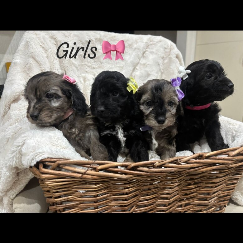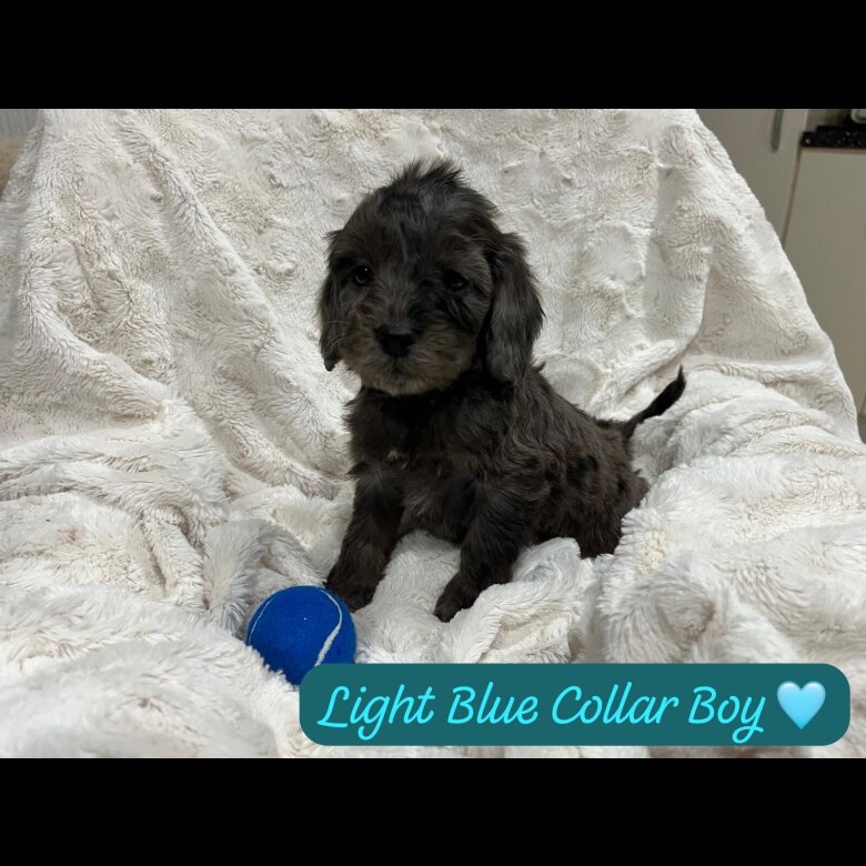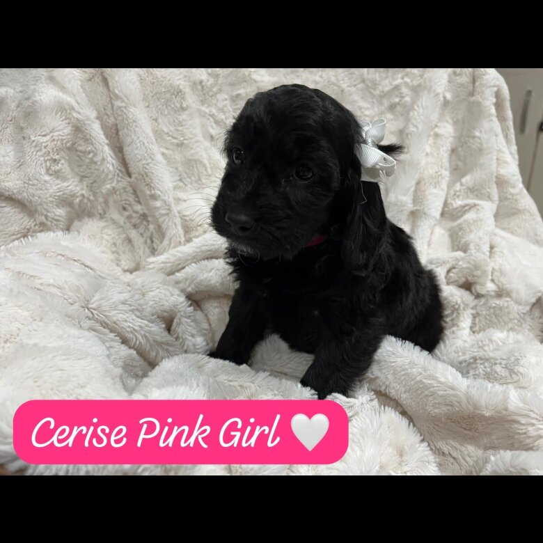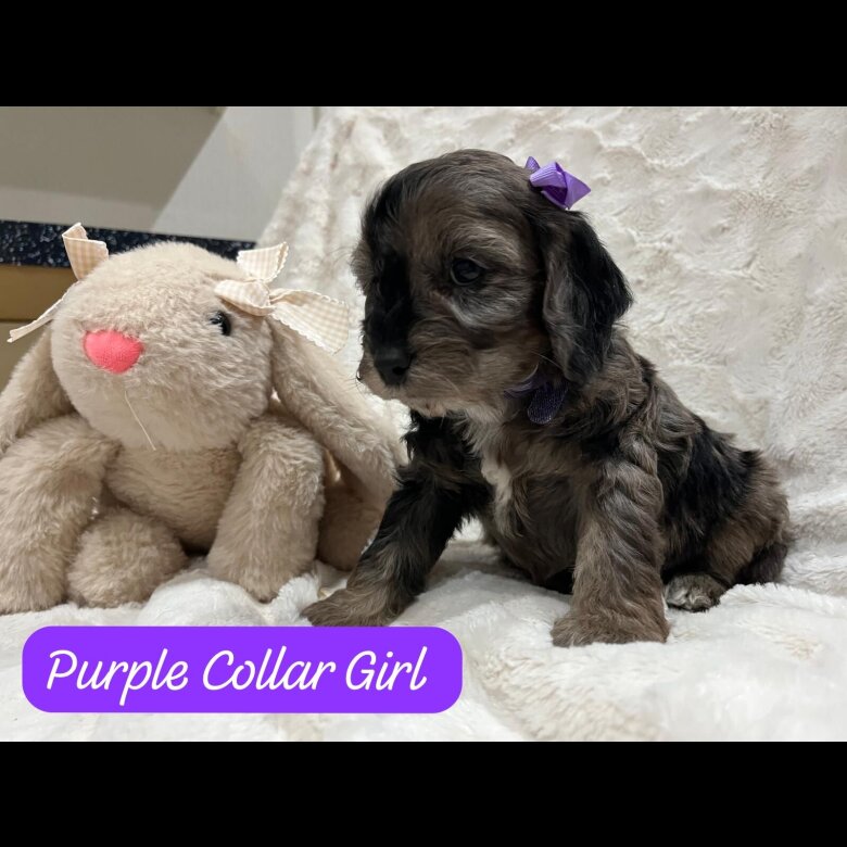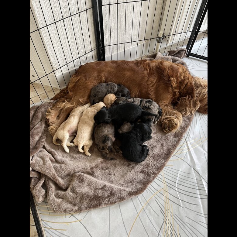9 beautiful F1 Cockapoo puppies, 4 girls and 2 boys still available. Raised with a lot of care in the heart of our family home, these pups are looking for loving families to grow up with. Mum is our cherished red show type cocker spaniel. She's had no past problems or health issues and has a lovely temperament. Dad was a very careful and deliberate choice - a handsome miniature poodle stud with the most bouncy, affectionate and sweet personality. He has been well health tested, proving what a strong and healthy boy he is. From the moment the pups arrived, they have been surrounded by the beautiful chaos of family life. They are growing up confident, curious, and well-socialised, and are already enjoying being held. PURPLE Collar Girl - Blue Merle AVAILABLE PINK Collar Girl - Blue Merle AVAILABLE CERISE PINK Collar Girl - Black + white markings AVAILABLE YELLOW Collar - Black + white markings AVAILABLE DARK BLUE Collar Boy - Blue/Chocolate Merl AVAILABLE RED Collar Boy - Apricot AVAILABLE Our lovely puppies will be: - Wormed up to date with panacur - Will have had their 1st vaccinations - Vet health checked - Flea treated at 8 weeks Every pup will be sent home with a going home bag that includes a vet card, puppy biscuits, puppy pads, a blanket carrying the scent of mum. A £200 non refundable deposit is required to secure a puppy of your choice. From this point forwards, we will make sure to give you regular updates and photos to keep you in the loop. Pups will be ready to leave for the new homes on the 27th of April. Face to face viewings are warmly welcomed for you to meet the pups. Please send us a message to enquire about one of our pups - no question is too big or too small!