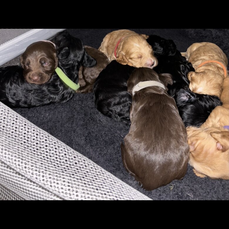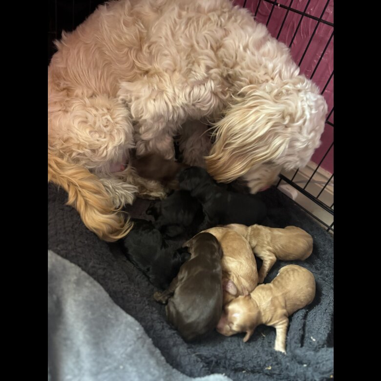 Here we have a wonderful litter of show cockapoos from my girl lassy she is a family pet loving, caring along with a very good temperament she has Brought up round 2 young children and a baby