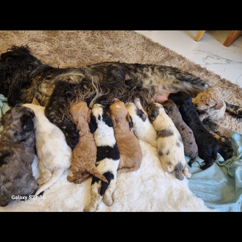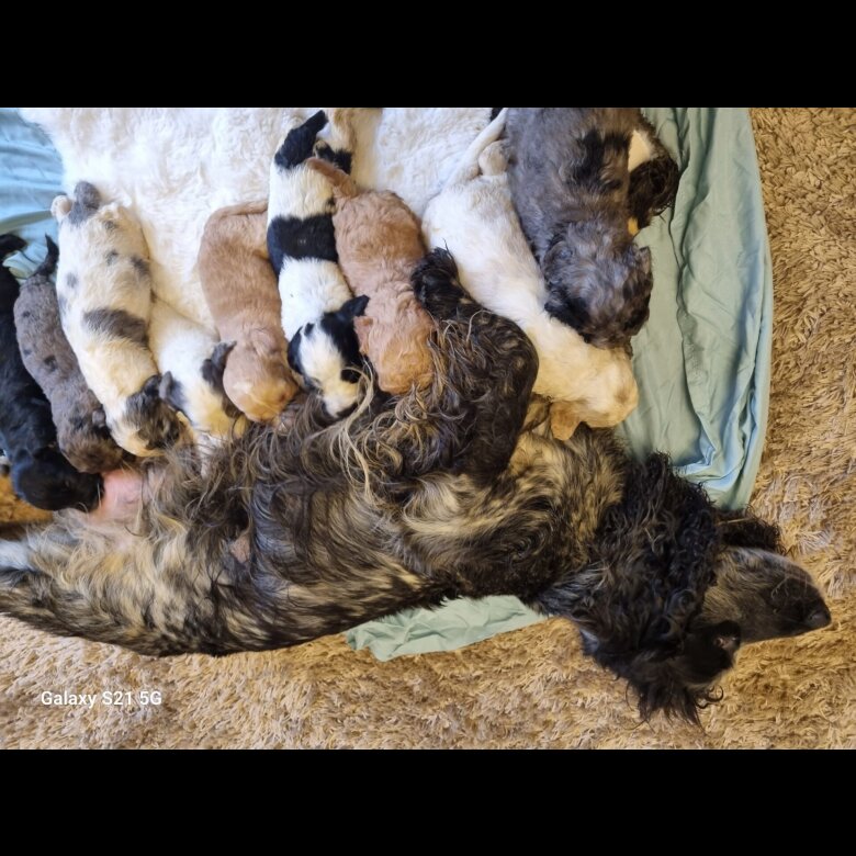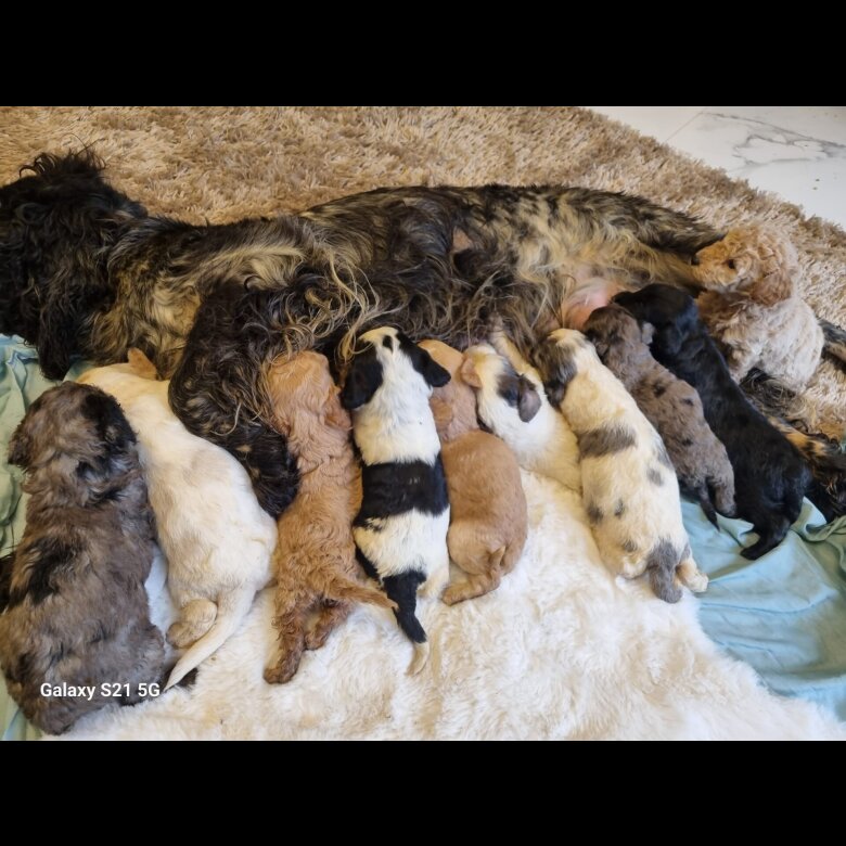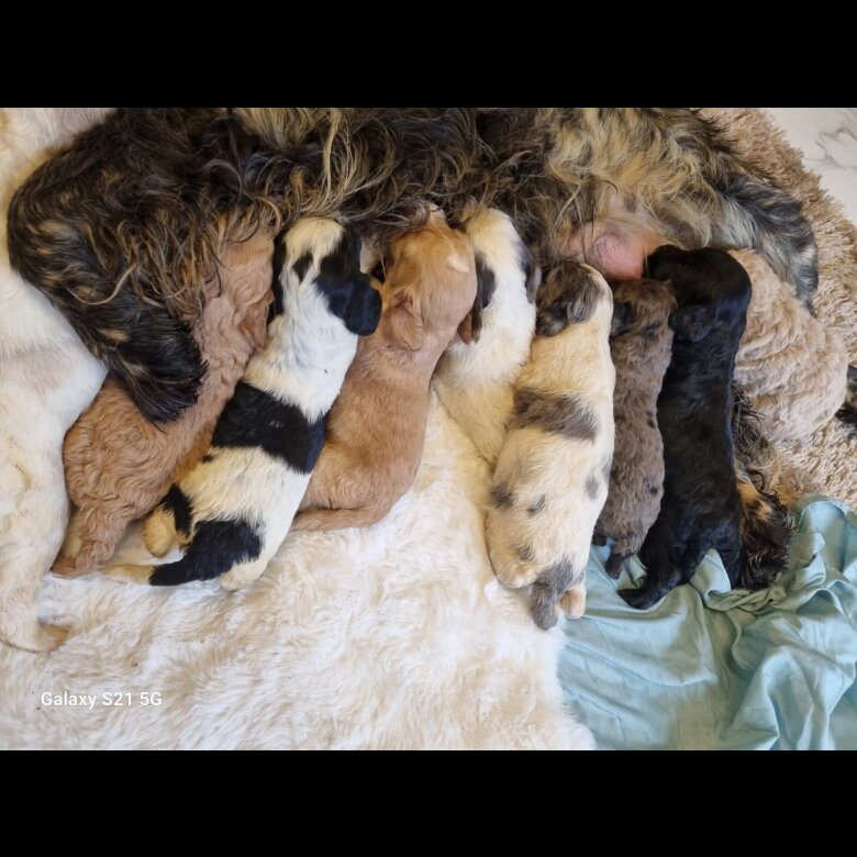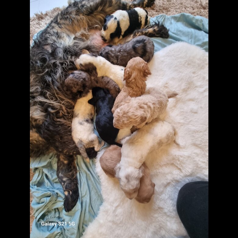 Hi my lovely lady has had a lovely little of puppies mom is a first time fantastic mom she's done really well with the puppies dad is a miniature mural poodle all puppies are different **** go to a loving homes they are use to kids as I have 4 kids and they are ready to leave mom now they are fully up to date with flea treatment and worm treatment and microchip with paper work for chip
