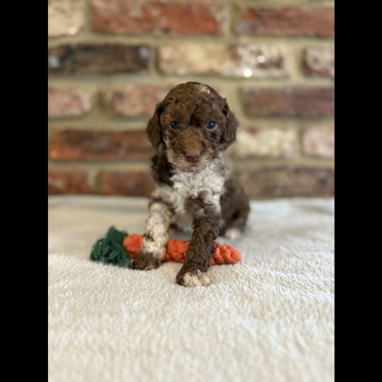 Our absolutely lovely natured cockapoo has given birth to a beautiful litter of F1b cockapoos. There are 3 girls and 4 boys and there is a lovely mixture of colours. All puppies have now gone other than one female Merle pup who is absolutely stunning. We kept her for an additional 4 weeks for her previous buyer, but they had a chance in circumstances so she is available again. She has had both Lepto 4 and DHP vaccines and is up to date with worming and flea treatment. She is microchipped and has been given full view of health by the vet. She is allowed to start going out and socialising fully on the 11th February.