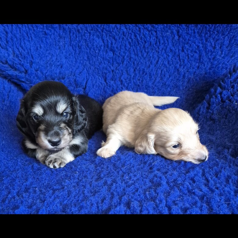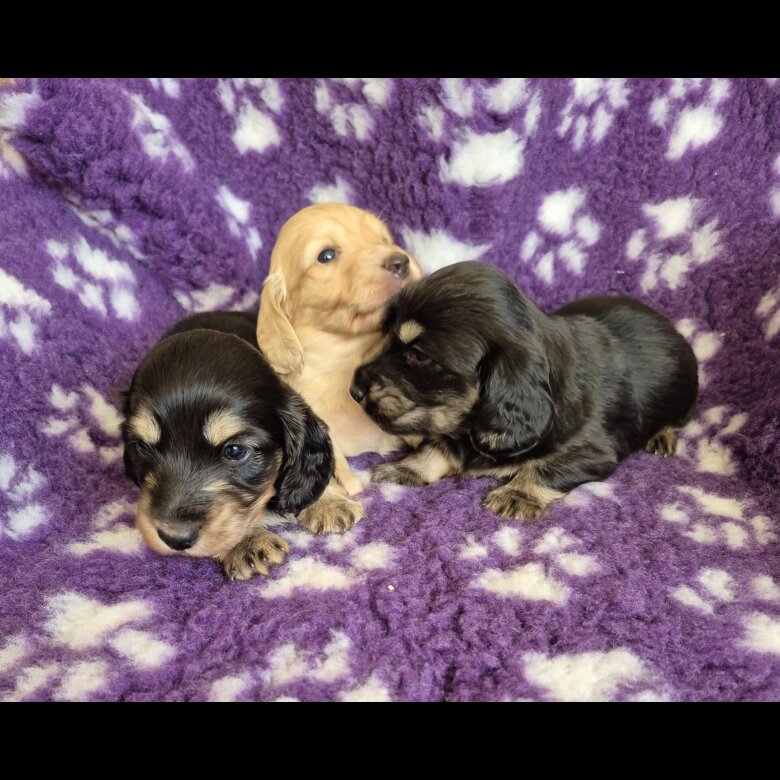 Beautiful litter of long hair miniature dachshund puppies. From a litter of 6 I have 1 pure cream boy, 2 black & cream boys and 1 black & cream girl available. Kc registered, pra hereditary eye clear, microchipped, 1st vaccination and regularly wormed. Ready for new homes on 17th January when 8 weeks old. Viewings welcome and a £200 deposit will reserve one of these lovely pups. Cream boy£2500, black and creams £1500.