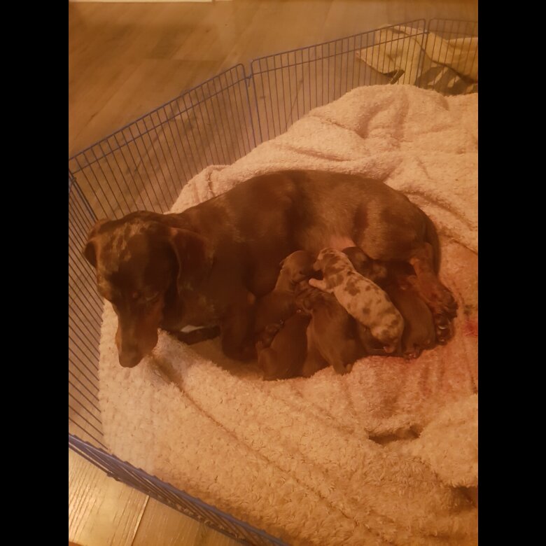 6 puppies for sale 2 girls 4 boys boys are £1500 girls are £2000 will be ready to leave in 6 weeks . Mother is a dappel and dad is not there is dappel in puppies. More photos or videos avialable on request.
