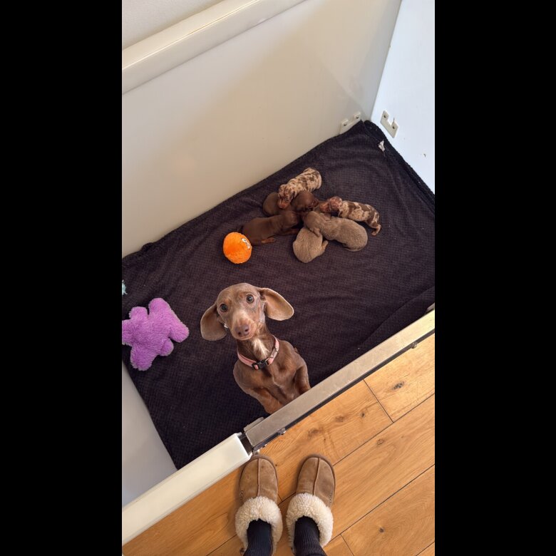 Our litter of Miniature Dachshunds arrived on the 21st February. Mum is a Isabella and Tan, has a lovely temperament and is PRA clear. Dad is our Chocolate Dapple stud and is also PRA clear. Both are available to view!
