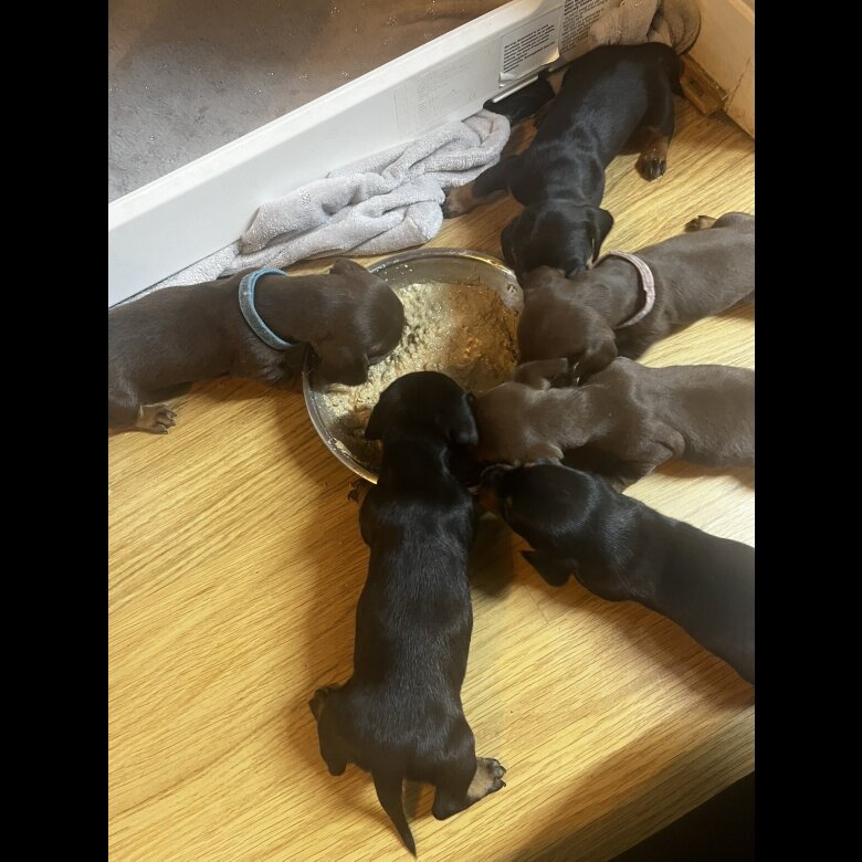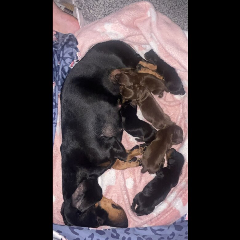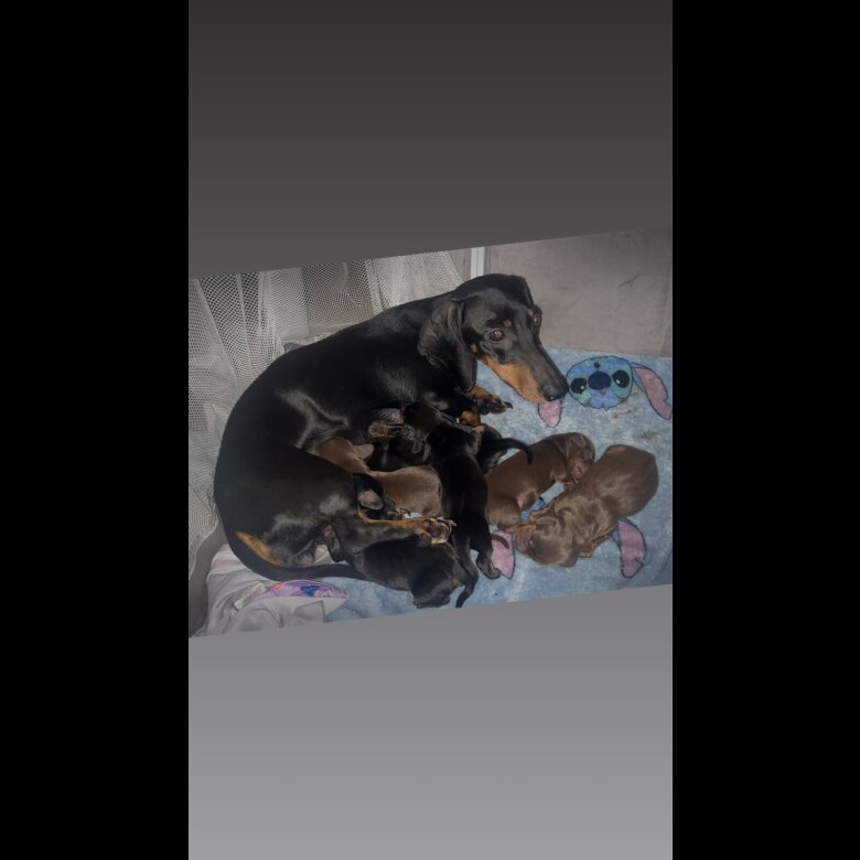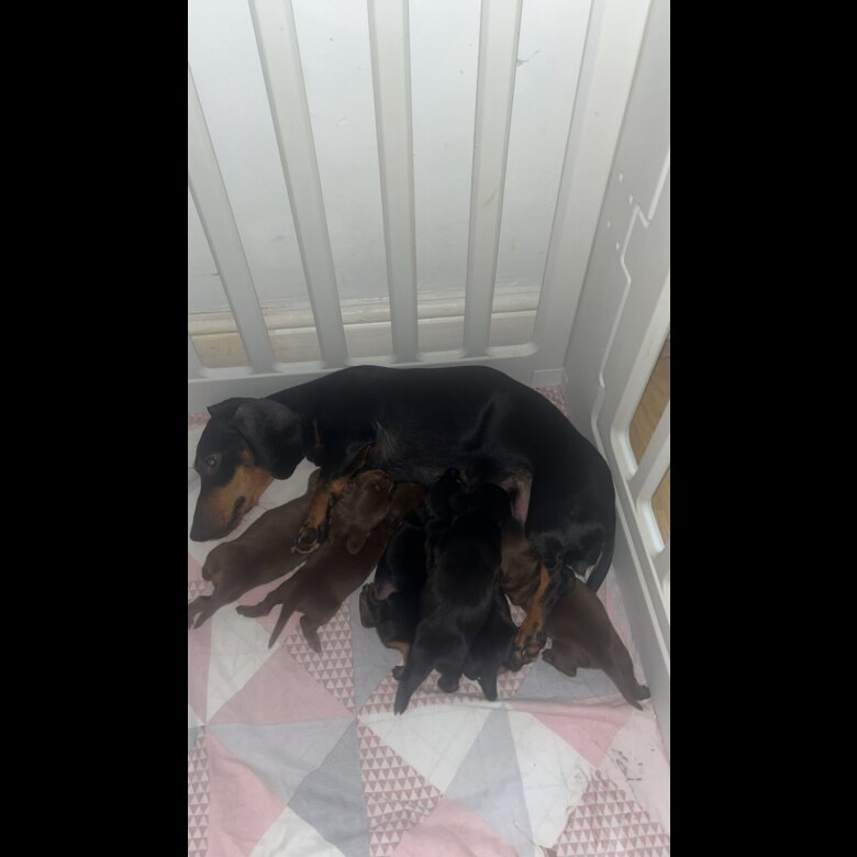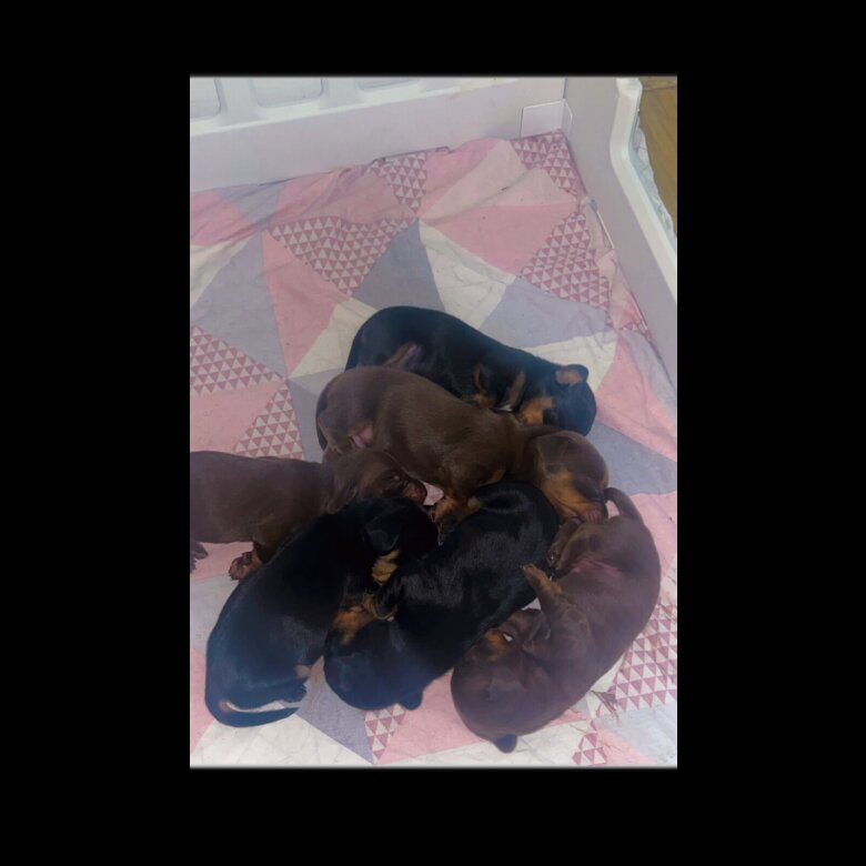 We are delighted to offer a stunning litter of six beautiful puppies, 3 left 1 girl and 2 boys all Black and Tan available to loving and responsible homes. Dam (Mum): Black and Tan, PRA clear, and fully vet checked. She is our cherished family pet, raised in a warm household with children, ensuring the puppies are well socialised and confident. Sire (Dad): Blue and Tan Miniature, PRA clear, health checked, and KC registered. He comes from an outstanding pedigree, grandson of the well-known Romford Dark Prince and Charlie Chaplin. (Please note: Mum is also KC registered; however, her paperwork has been misplaced.) Puppies will be: Raised in a family home environment Accustomed to everyday household sounds Available to leave from 24th December 2025, just in time for Christmas Optionally vaccinated and microchipped prior to leaving (price adjusted accordingly) โ Both parents are PRA clear โ Health checked โ Viewings welcome โ No offers please โ prices are fixed These puppies have been bred with excellent temperament and health in mind. Only serious enquiries from loving, permanent homes will be considered.