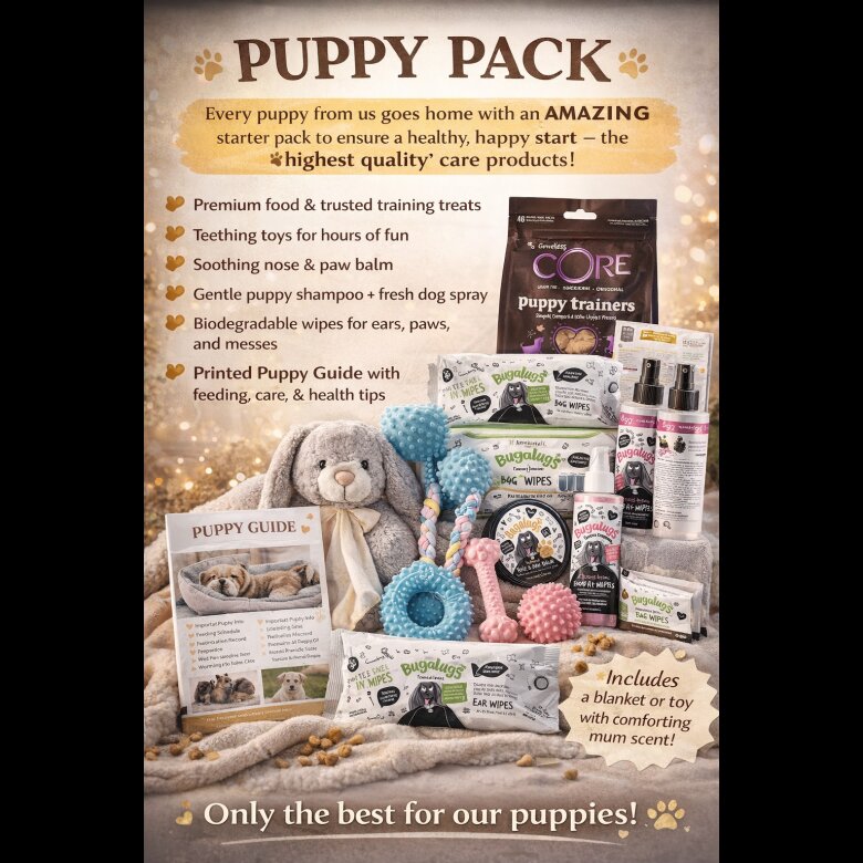 Each puppy will leave us with a thoughtfully prepared puppy pack, Kennel Club paperwork, health records, microchip, up-to-date worming, and ongoing support.
