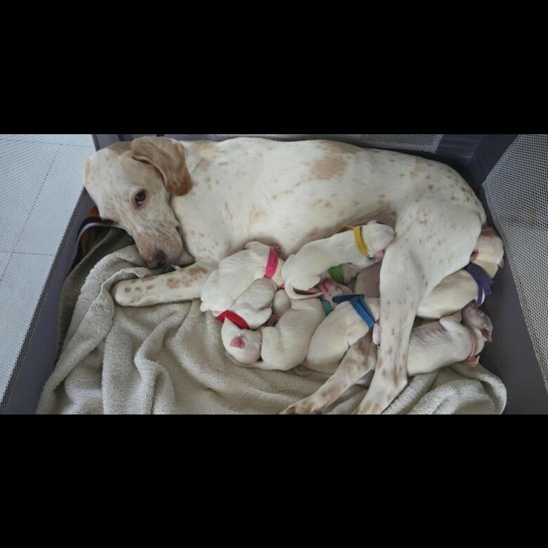 UPDATE- all boys are now reserved only 1 blue collar girl available English pointer x saluki cross greyhound puppies born 12/1/2026 Dam is a lemon and white english pointer from working bloodlines (pictured above) Sire is a light fawn saluki cross greyhound from working bloodlines (pictured above). I have pics of both sires parents and dams mother if needed. Pups will be socialised with children, other dogs and cats. Also pups will be desensitised to normal daily husbandry noises and environments. Pups can be introduced to some livestock if needed as have horses and **** pup will leave with a birth certificate, microchip, both vaccinations, full health check, be flea'd and wormed, collar+tag+lead, blanket, basket of toys, poo bags, pup pads, treats+tub and change over food with 2 bowls. Lifetime back up will always be available for each **** to message for more information, viewing are welcome but will need to be booked in advance. Non refundable £100 deposit will be required once you have viewed and chosen your pup. Boys are £700 and girls are £850 pups will not be ready to leave until they are 12 weeks of age and have been paid for in full before leaving on the 6th of April 2026- no payment plans based in Northamptonshire
