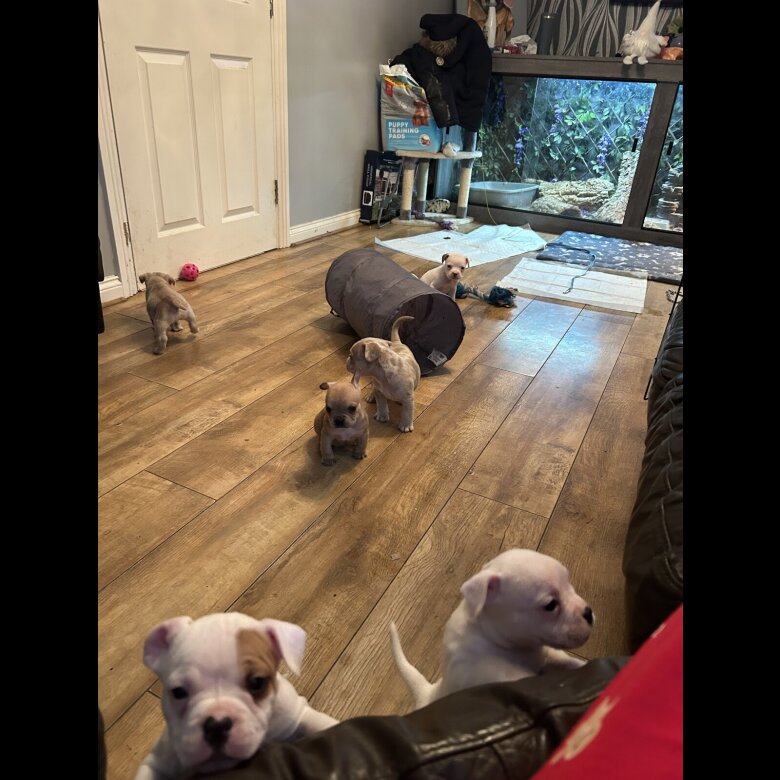 I have a litter of French bulldog x American bulldog puppy’s 5 chunky boys and 1 girl!very playfull 6 weeks old love cuddles they will be ready to go to there new homes on the 21/12/25 they will be micro chipped as they are sold also worming is being done when should be these are very loving pups so please grab your self a bargain and get your self a new friend for life 650