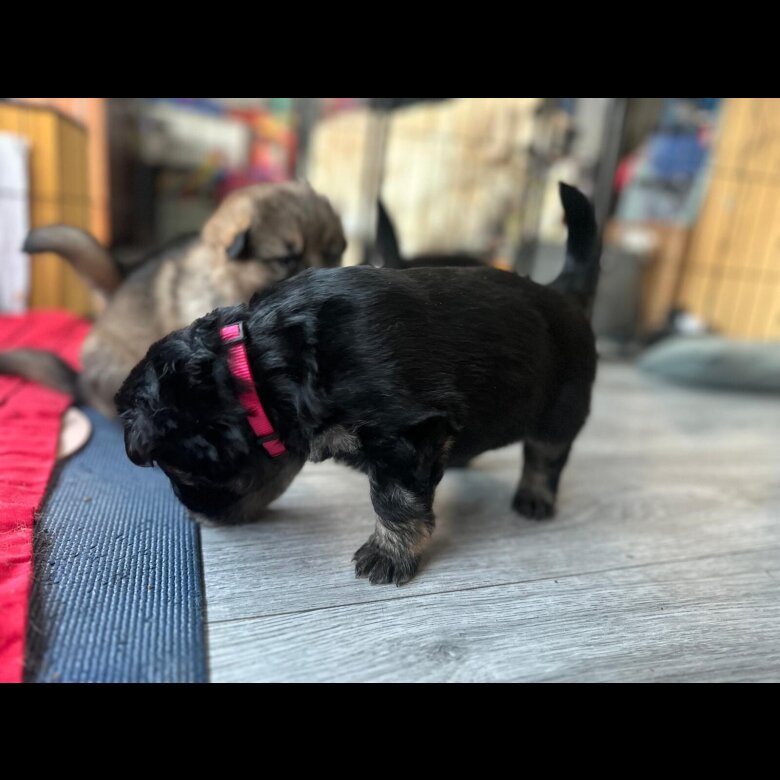 There are 6 boys and 1 girl, a mix of rich tan and solid black coats, each with their own gentle personality already beginning to shine.