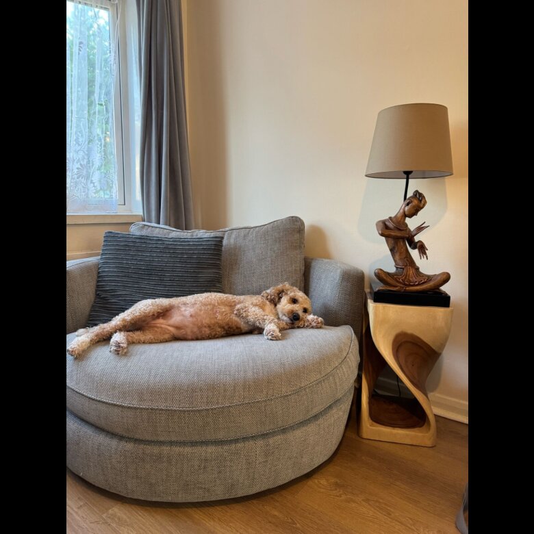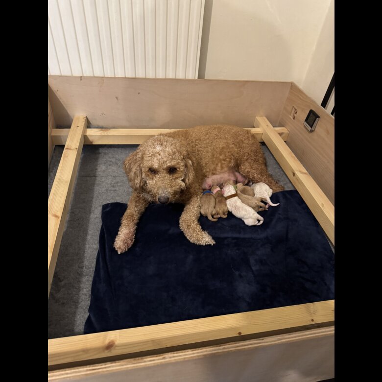 Mum is our much loved stunning 2 year old Mini Goldendoodle family pet Noodle. She has the most loving nature and is the most fantastic mum to her puppies. She loves nothing more than a fuss being made over her and enjoys playing with my 3 children who are all under 12 years old. She has the most beautiful white and cream non-shedding, curly coat.