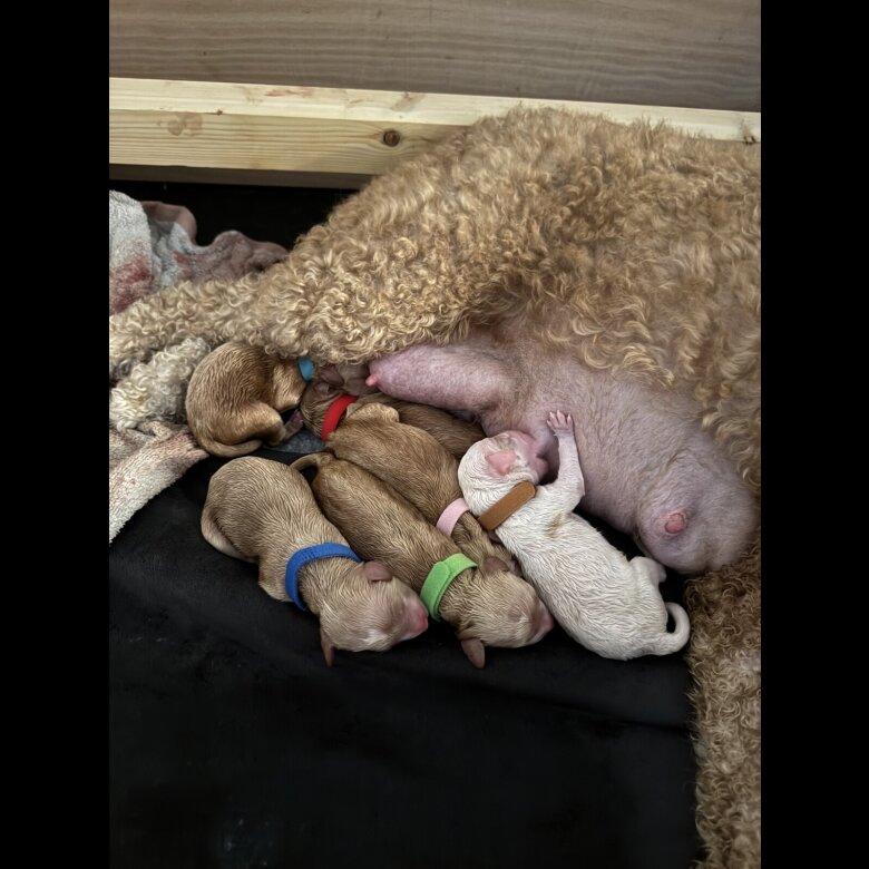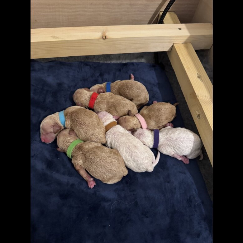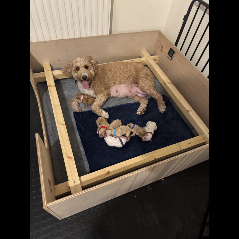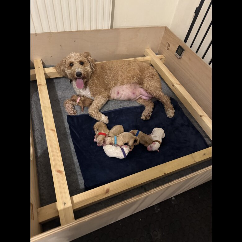 We are absolutely delighted to announce that on Wednesday 17th September, our beautiful GoldenDoodle, Noodle has safely given birth to her second stunning litter of 7 Cockadoodledoo Puppies 🐶 1 girl 🩷 and 6 boys 💙 🐶