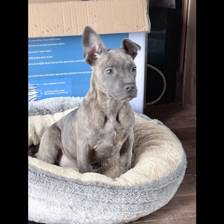 Beautiful staff x Frenchie 1 girl she due to time wasters she is available will be upto date with flea and worming, microchipped. Very gentle very playful loves sleeping on you and cuddles will be having pad training ready to to there forever homes please no time wasters