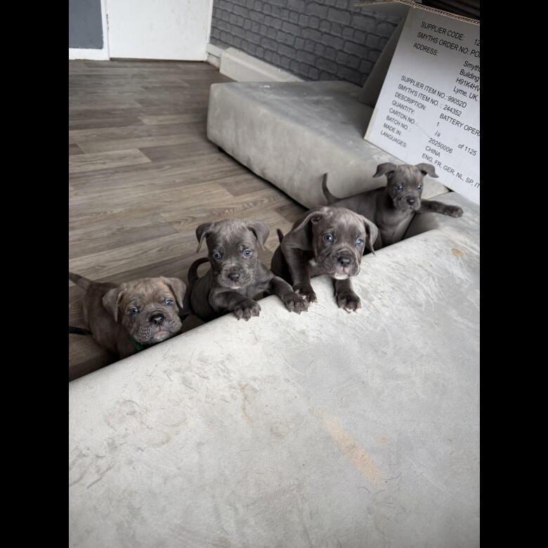 Our family pet Medusa delivered a litter of 8 beautiful Cane Corso x English Bulldog puppies on 23rd August. For collection from Rochdale area and now available for sale I have 1 black with brown paws left £800 they All are using toilet pads and all well behaved. They are good healthy eaters, combination of foods , puppy milk, meat and dry. 5 Weeks FREE Agria insurance also comes with each puppy