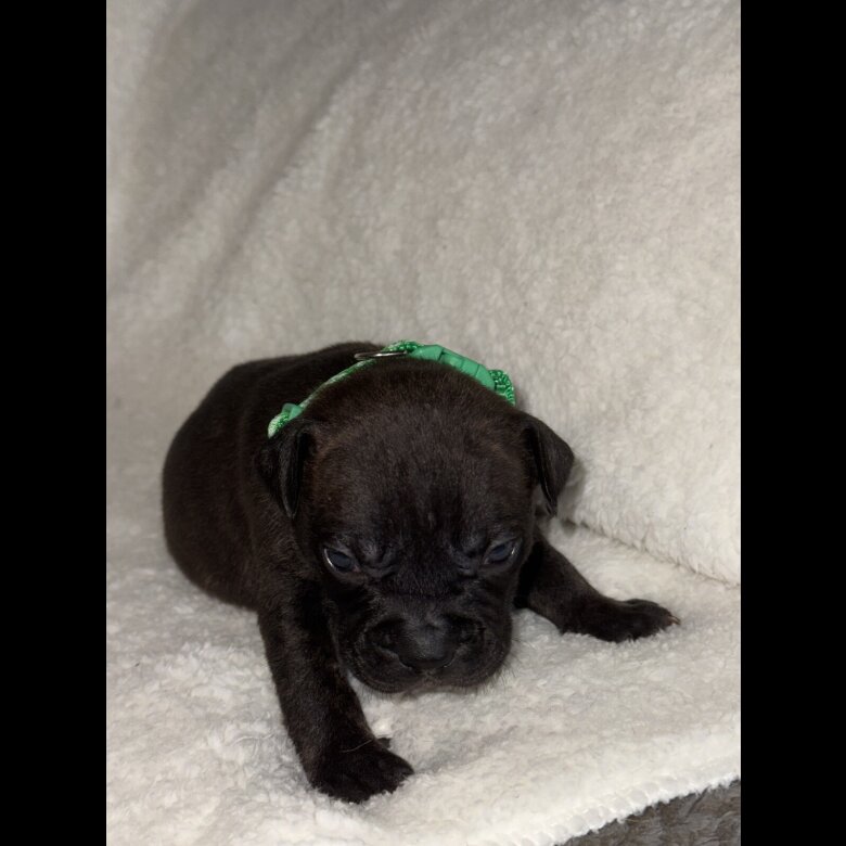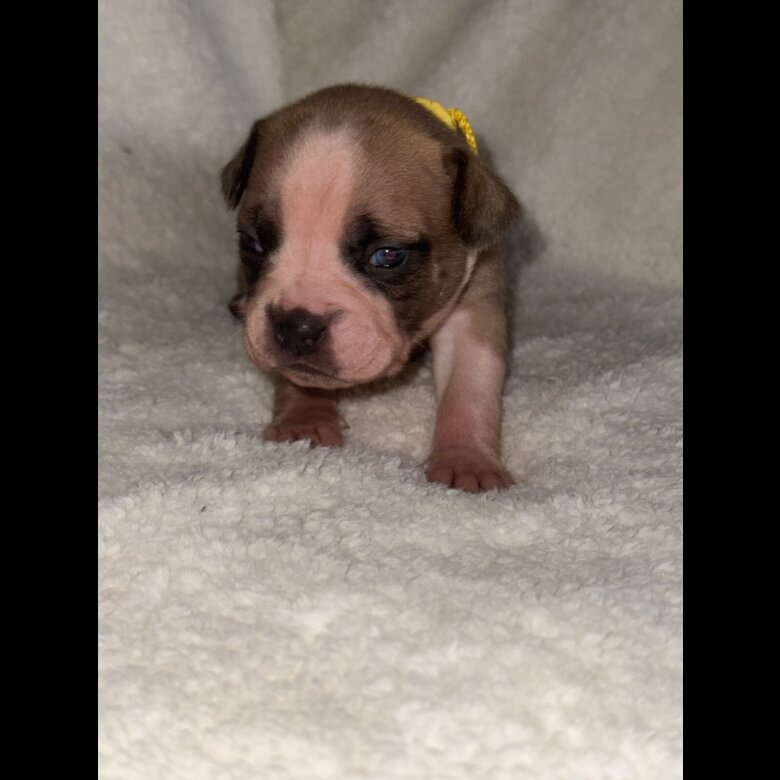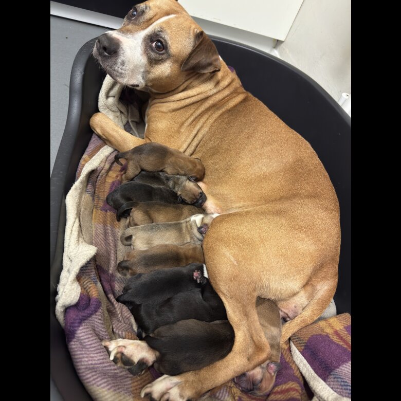 Both mom and dad are family pets so can be seen with the puppies. Mom is a staffy (red) and dad is a kc registered French bulldog (blue).