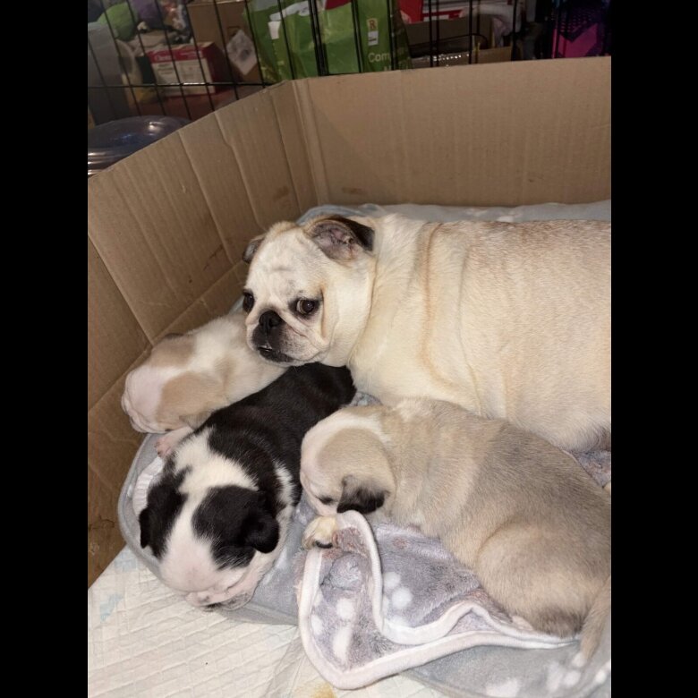 I have 3 Panda Male pug puppies available for their new homes on the 17th May 2026 . All have brilliant Temperaments just like their parents whom we have , we also have Granny and Daughter from a previous litter . The Parents are PDE clear . All puppies will come with a puppy bag which will contain everything you need for their transition to their new home with you . Puppies are available to view , they will be Microchipped , flea and wormed before leaving All the boys will be weaned on Iams Puppy to give them the utter most best start. The Puppies are : Max , Male Fawn/sable Panda , 2 blue eyes with patches Bean , Male black & White Panda with 2 blue eyes Dogsby , Male Fawn Panda with 2 blue eyes All 3 have very different personalities but are all very loving They are Full pug but will not be KC registered as you can not KC register a Panda pug (not a recognised colour) We Require a Non refundable deposit upon Viewing your chosen puppy . (only request this due to many wanting one but never showing up to pick up puppy from previous litter )
