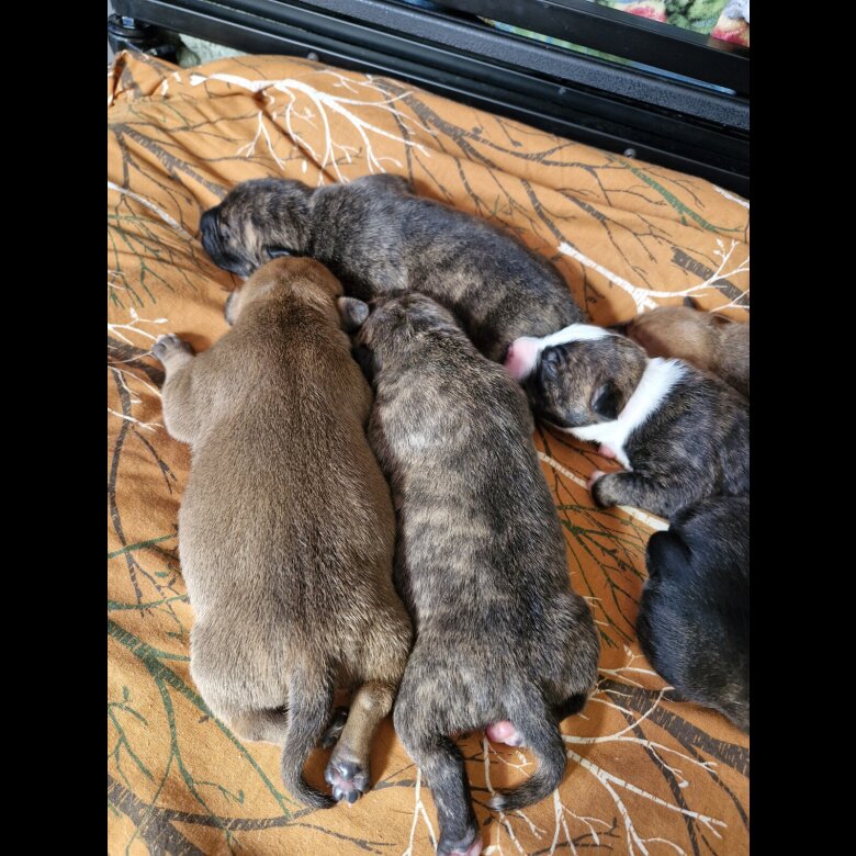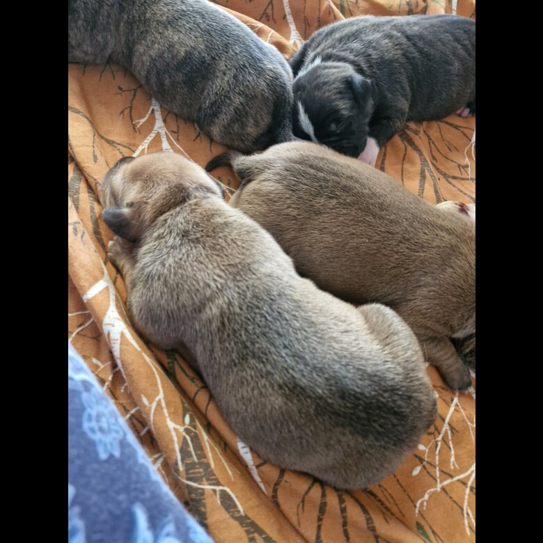 My Girl has given birth to her first litter, 4 chunky beautiful boys and equally chunky girls. Both girls are practically identical, brown,black brindle colours and the boys again 2 identical red and 1 is brown, black with some white markings and the other dark brown,black with a small white marking on the head. All pups will be well handled and socialised with other dogs and children. All will be vet checked and microchipped and also a scented blanket of mum.