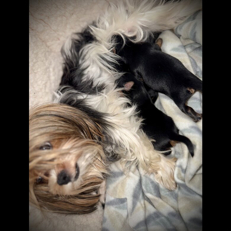 Mum is a stunning 3-year-old Biewer Terrier with the most gentle, calm, and loving temperament – truly the best mummy to her babies 🤍🐾