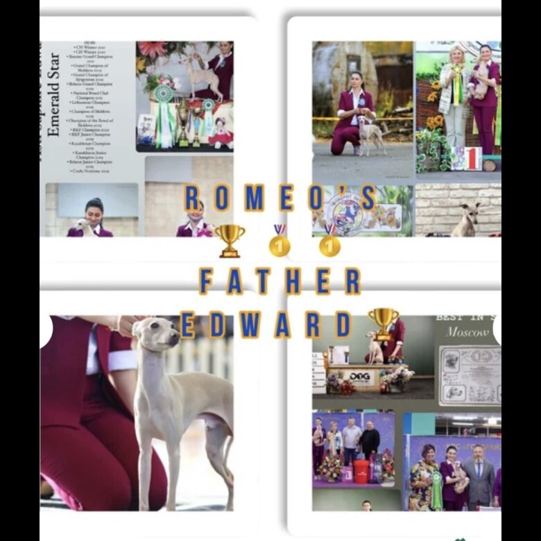 Romeo our handsome Italian greyhound Russia import Parents champions and fully health tested clear He is Kc registered Just sired a little of 7 babies PICTURES OF RECENT PUPPIES CHECK OUT HIS DAD EDWARD CHAMPIONS 🥇🏆🥇🏆🥇🏆 Picture added Also check his Mother on photos Beautiful 🩷 Romeo comes from exceptional lines champions all throughout just go and check out his father 💙 Romeo has the best pedigree. He gives super heads and a beautiful colour on puppies if you want quality this is the boy for you excellent example of this breed DNA: ayay dd ee Romeo will 100% pass a copy of blue & cream to his offspring Colours he can produce: Fawns, Creams, Blues, Blue Fawns, Blue Creams And at the moment he is producing a lot of girls 💗 We offer 2 mating payment on first mate Also a free scan included in price if your girl does not get pregnant we offer a free return on same girl next time So Please feel Free to contact us thank you
