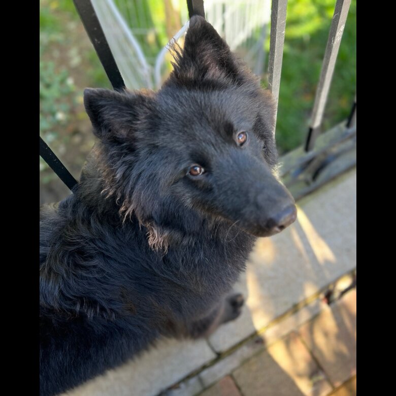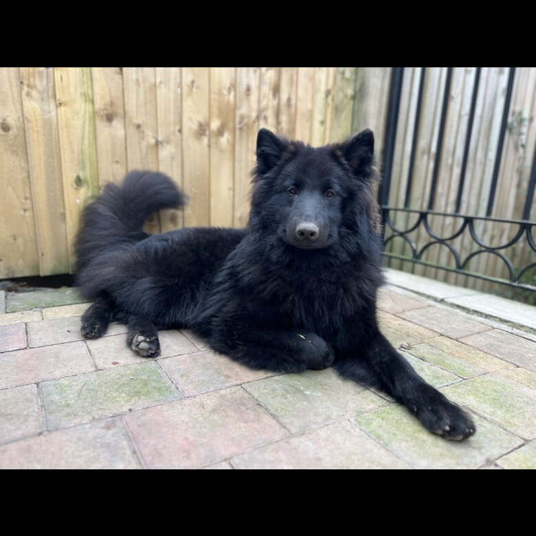 Gorgeously handsome male, solid Black carrying White, Mum is a Samoyed (we own the Mum) and Dad a Black German Shepherd (hence the inherited Black coat from a recessive Black dog).
