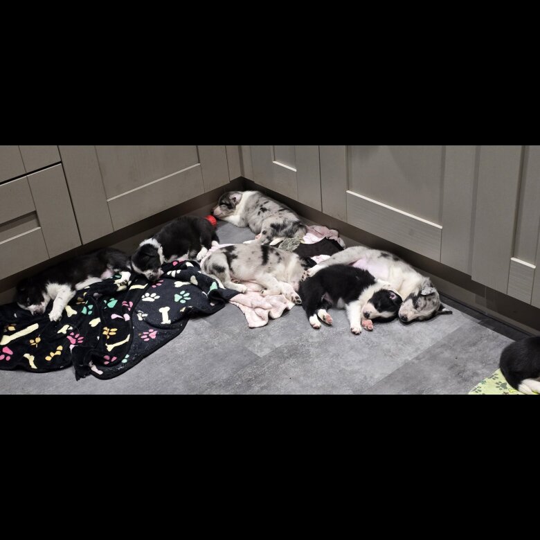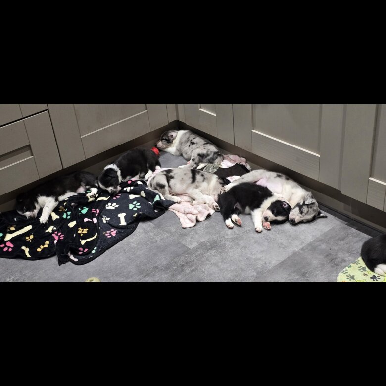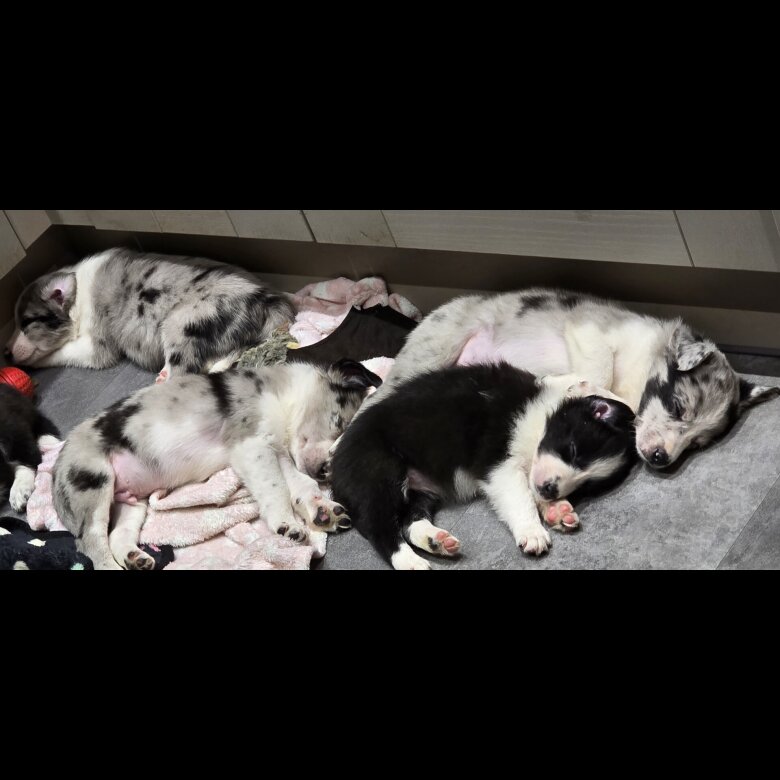 We have a lovely variety of colours and coat types to choose from. Three of our boys are striking blue merle, whilst the fourth boy and all four girls are classic black and white. Two of the girls have beautiful long coats, with the remaining puppies appearing to be short-haired.