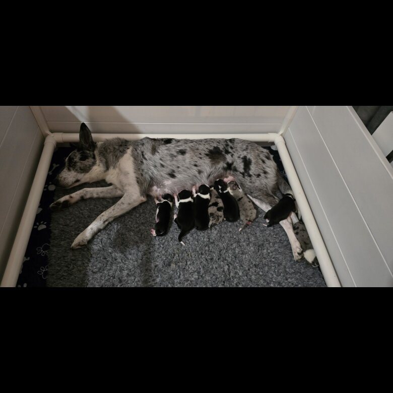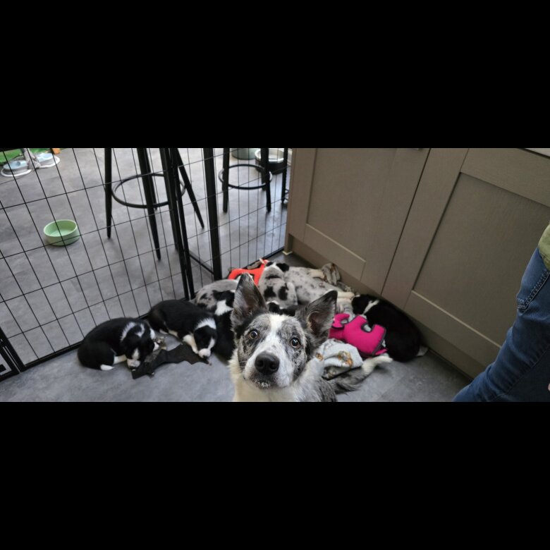 Mum (Nova) is our beloved blue merle girl with a short coat. She's an active, fun-loving dog who adores her walks, loves to swim, and nothing makes her happier than chasing her ball or frisbee. Dad (Oakley) is a handsome ee-red boy with a gorgeous long coat and the most laid-back, gentle temperament. He's from a Kennel Club registered line, although he doesn't have papers himself. He absolutely loves children and is a complete cuddle monster. Both parents are very much part of our family and are available to meet when you visit.