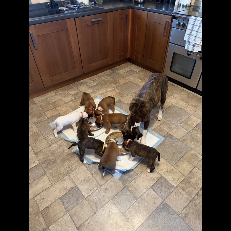 We are proud to offer a stunning litter of chunky Boxer puppies from our much-loved girl, Roxy. This is her first and only litter, and these precious pups have been raised with exceptional care, love, and attention in a family environment.