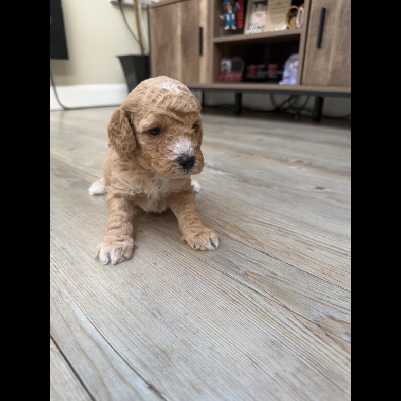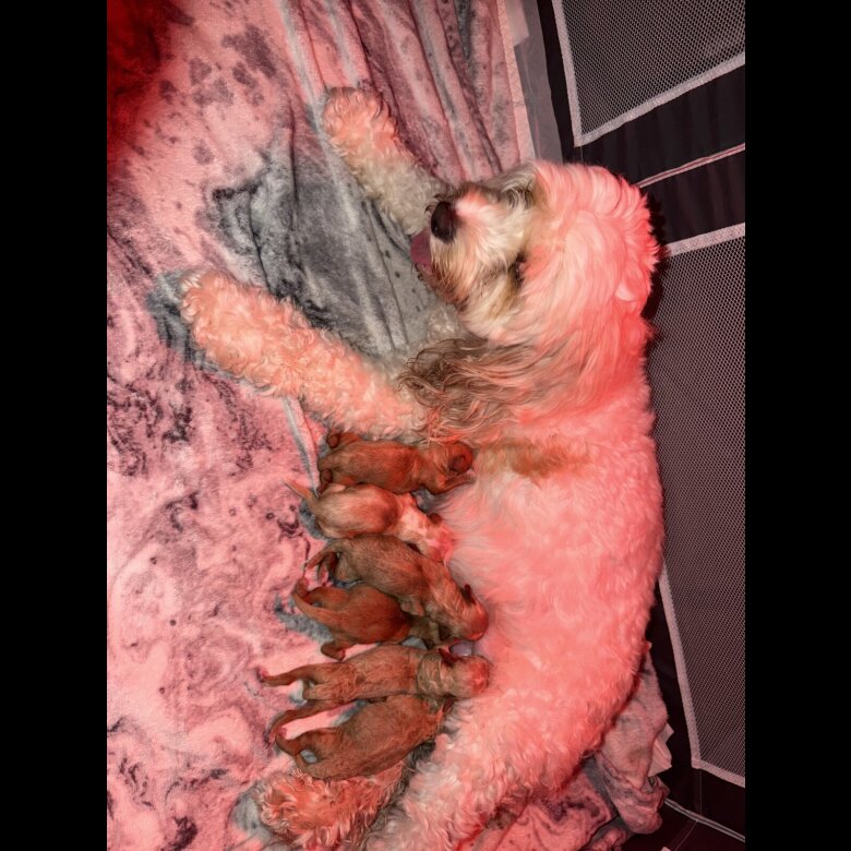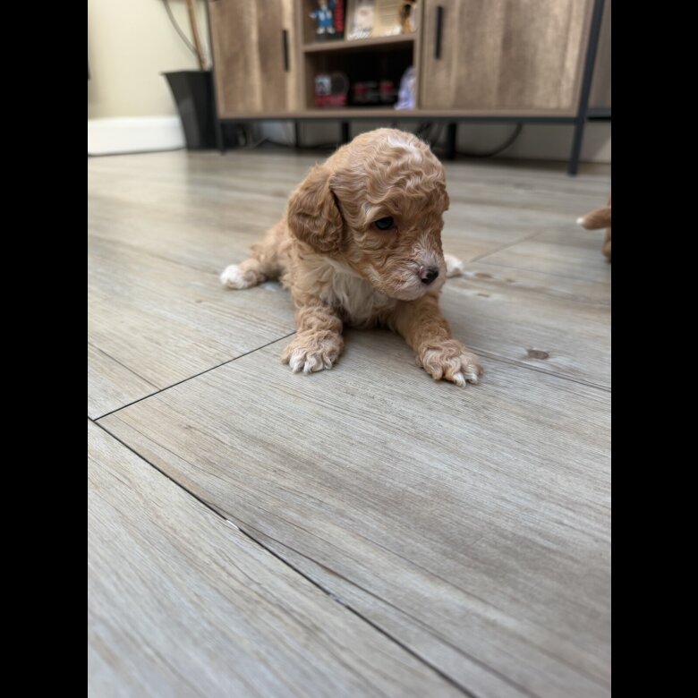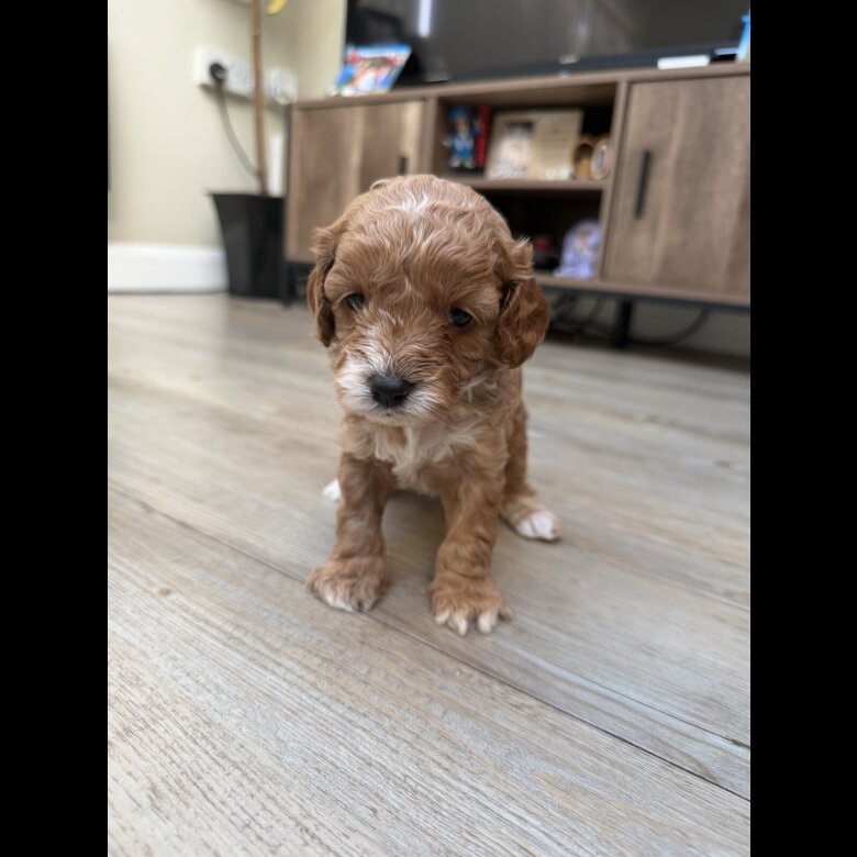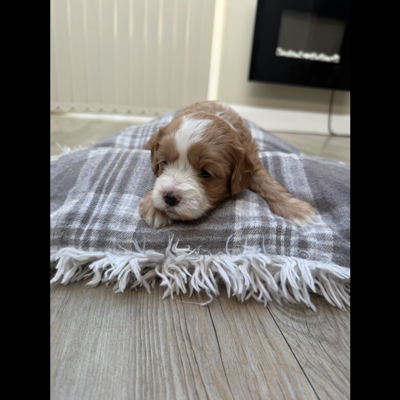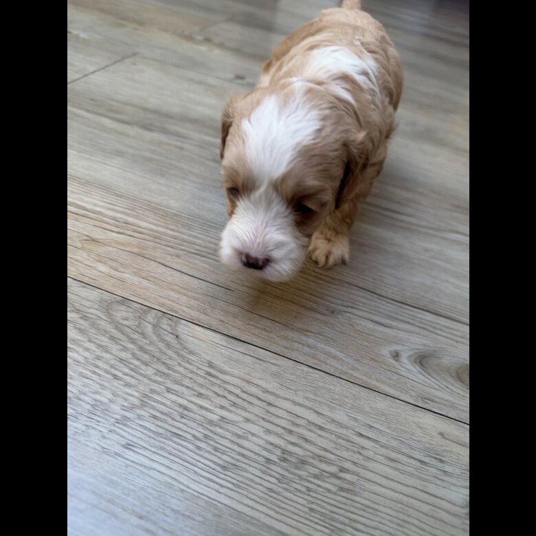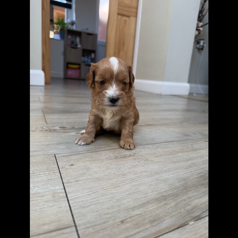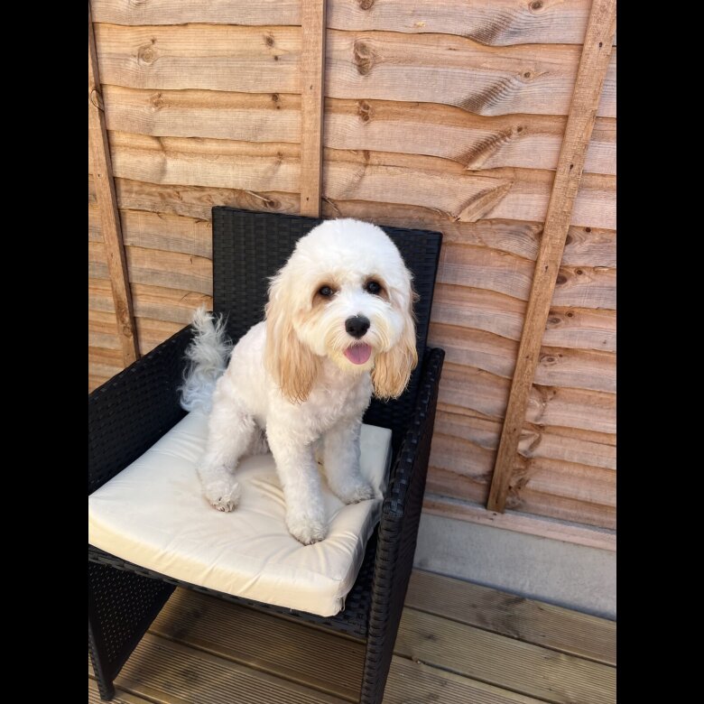 Merry is a rare white Cavapoo whit chocolate brown mum poodle and Blenheim cavalier Dad . She is our little girl at home and our princess. First and only litter as we will keep one and that’s the reason for breeding her .