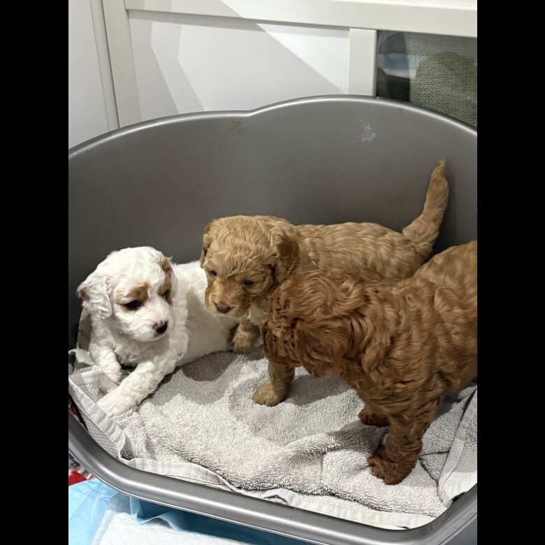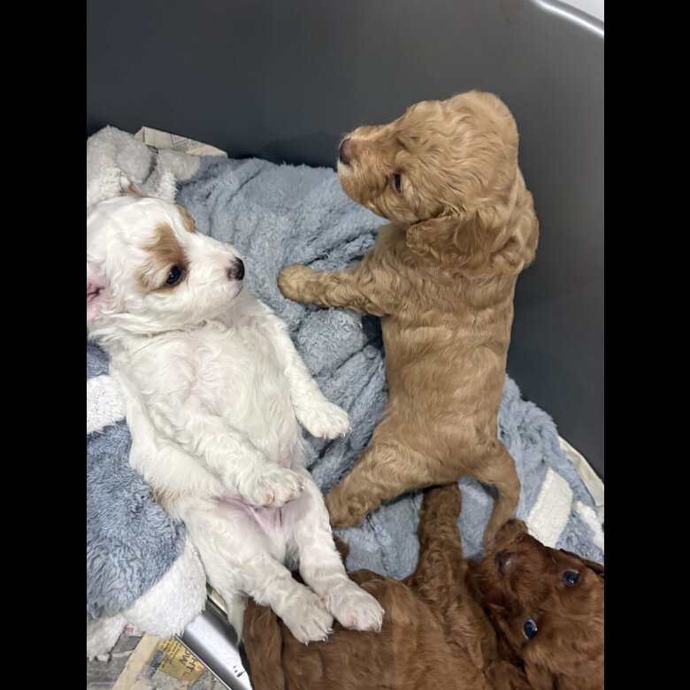 Our beautiful cavapoo Hazel has recently given birth to 5 adorable puppies, her first litter! We have available 2 girls, and one boy, looking for loving forever homes.