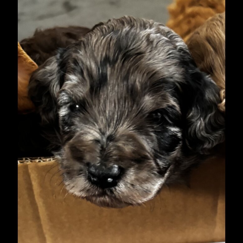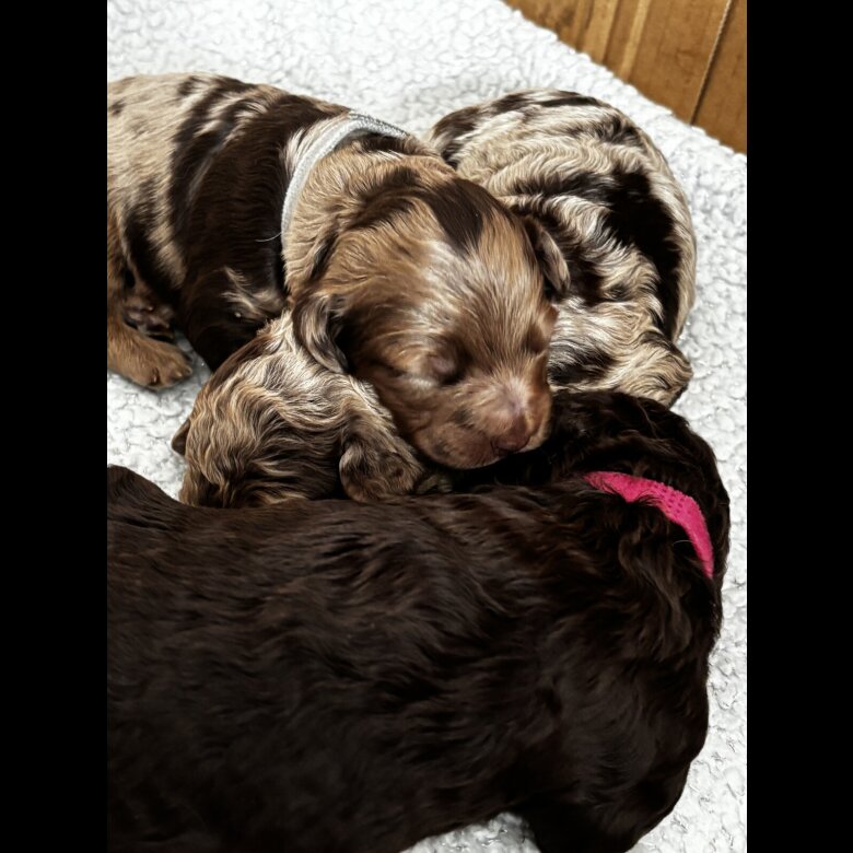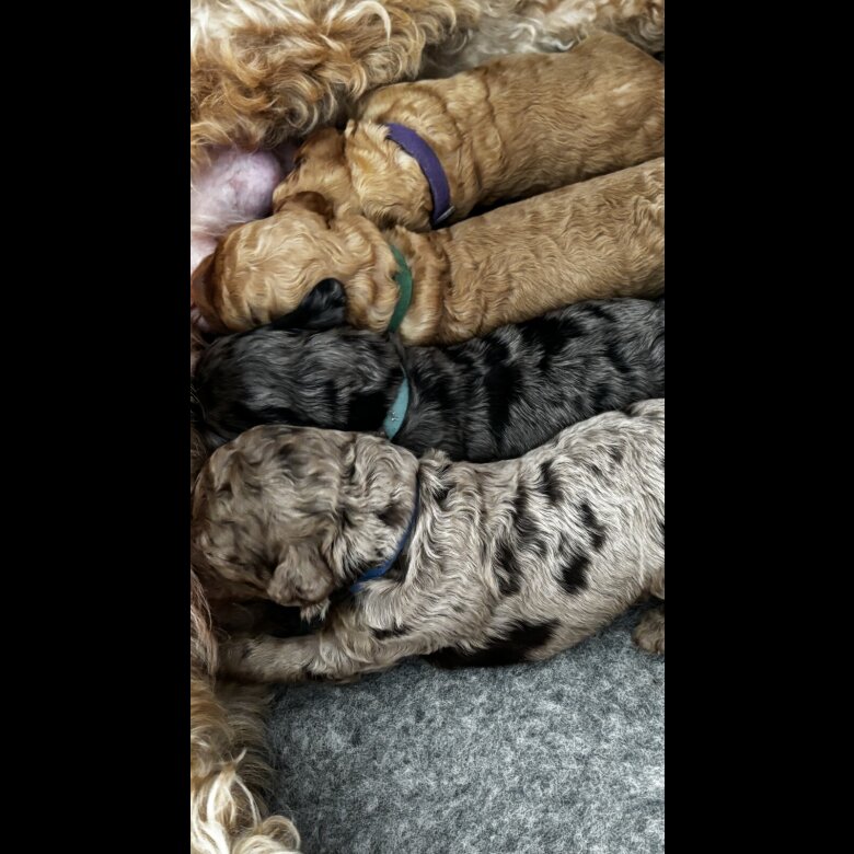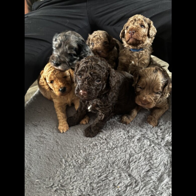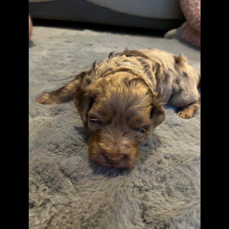 4 weeks old. 3 girls and 4 boys. Born 28/03/26 looking for their forever loving homes .A gorgeous litter of 7 merle cockapoo puppies. mom is an apricot cockapoo whose father was a Merle producing some gorgeous Merle colours. Mom has one beautiful blue eye and heart shaped nose. Dad of litter is a black cockapoo. Both mom and dad have been brought up around young children ,they love to play and go on walks and are very loving and also very intelligent .both mom and dad can be seen. both come from very good bloodlines. will be leaving with a goodie bag of toys food pads and first 2 injections wormed micro chipped and health checked. for any questions please don’t hesitate to message **** will be released at 9weeks. £250 DEPOSITS ARE NON-REFUNDABLE