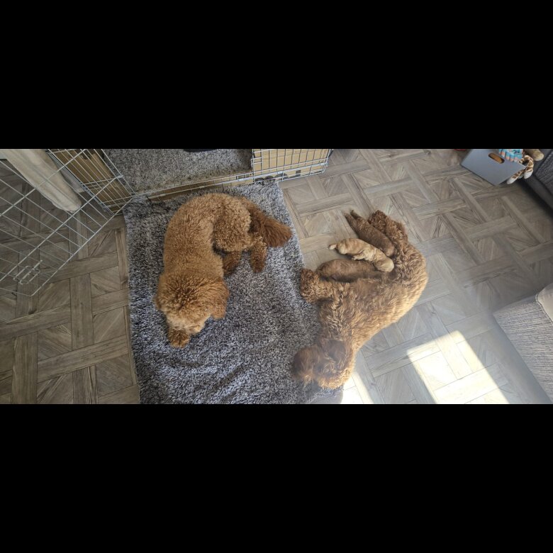 This is mum's first litter and she has taken to motherhood so well cleaning puppies and going back into her crate to feed them on demand.