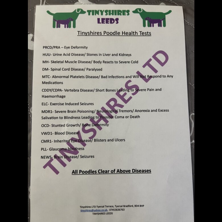 MY puppies mother and the father has undergone DNA health tests, clearing them of genetic diseases. My health tests have been conducted by Laboklin and USA. No other breeder matches my level.
