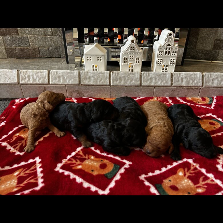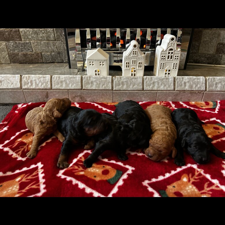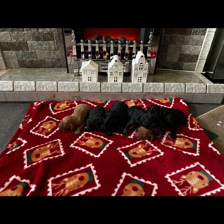 My girl Darcie has had a beautiful litter of Toy Cockapoo's. There are 6 in total 1 all black boy, 1 black boy with white back paws, 1 Black and Tan boy, 1 all black girl, 1 red girl, 1 red boy. Darcie is our family pet she stands at 17 inches tall and dad is a red toy poodle who stand at 14 inches tall and weights **** All will come vet checked with first vaccinations and microchip. Viewing's welcome, And I will have weekly updates of your puppy for you. All ready for their new home the 27th January. Non refundable deposit of £375 to secure your puppy.