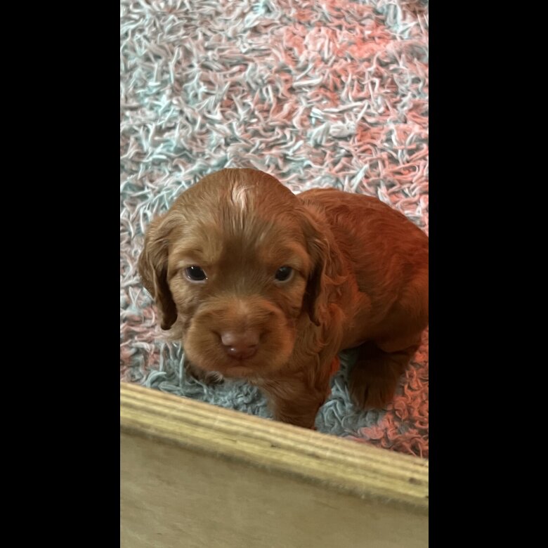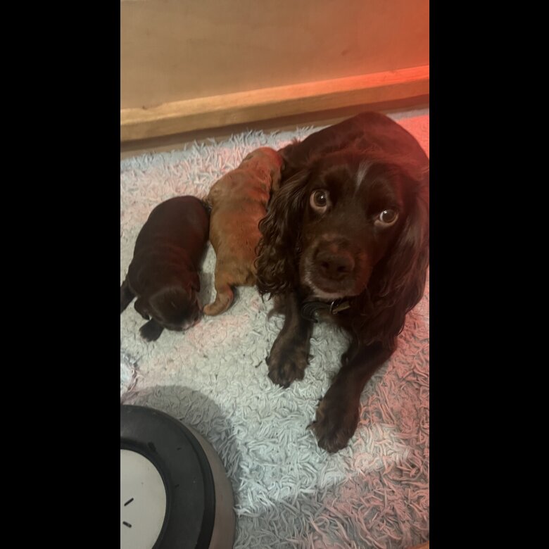 My Darling Bumble has had two little girls, one brown and one red. Both the parents are the perfect match of amazing working dogs and the best family pets. The puppies are being raised in my family home with my children and lots of other animals so they’re already used to a busy house and lots of snuggles. They have legally had their tails done at a vets and will have paperwork for that along with the kennel club registration etc.