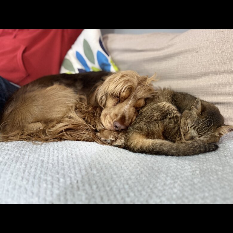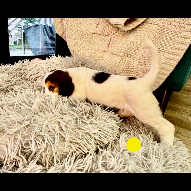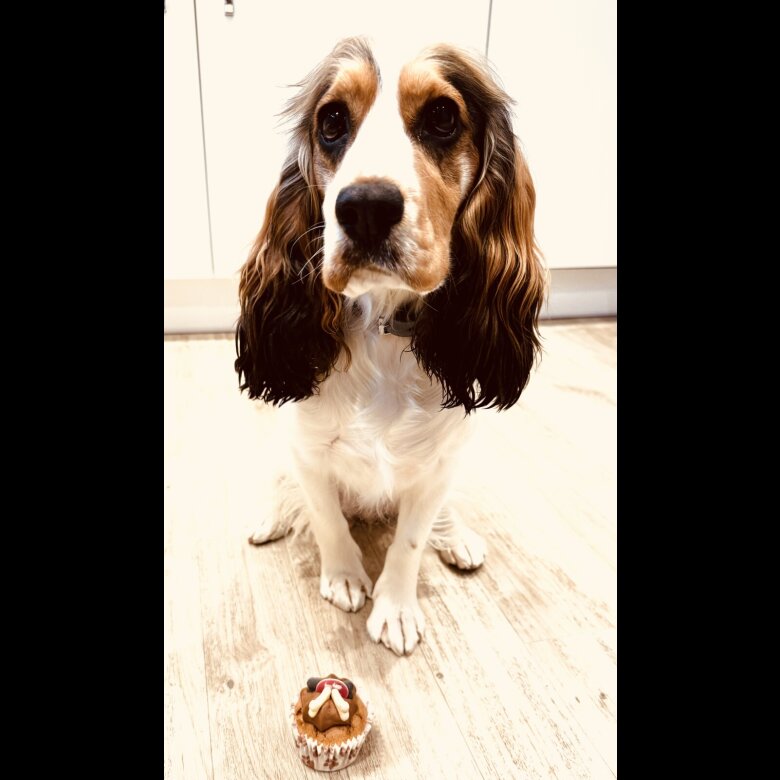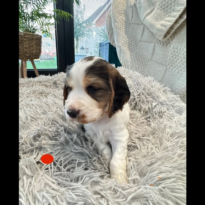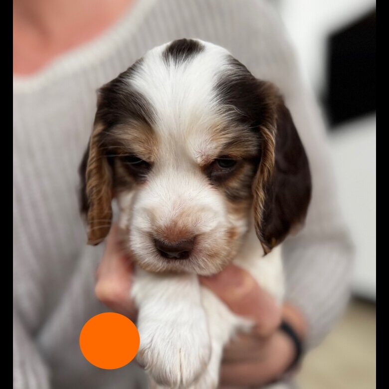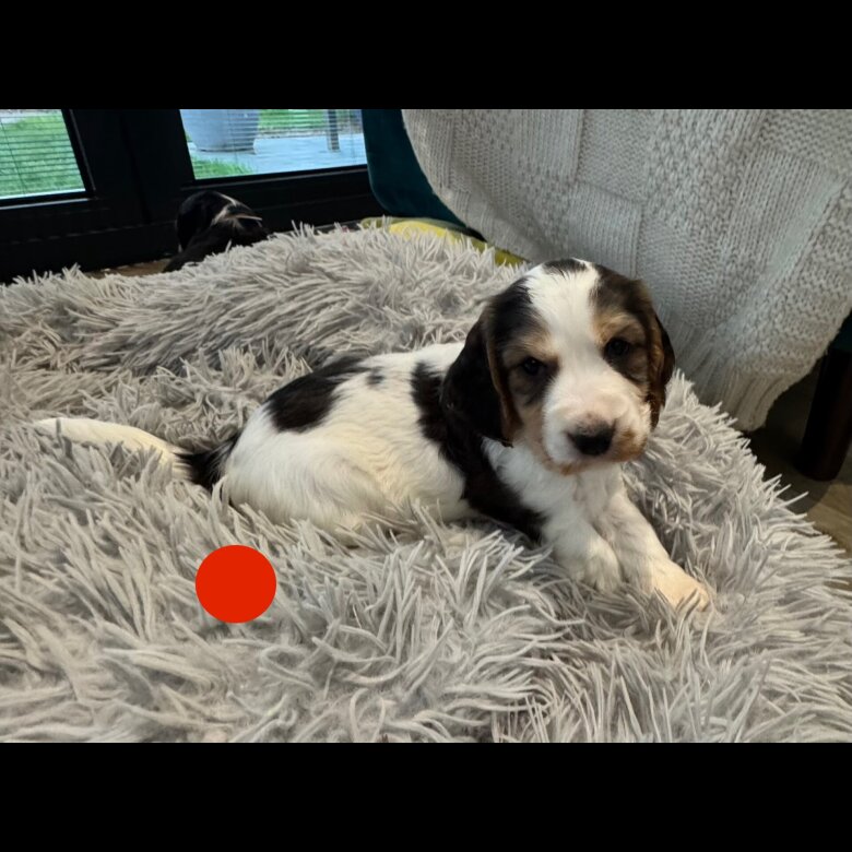 Nala is a dream dog with lots of energy (like all working cockers), loving temperament, great with our kids and cats, and loves a cuddle. She is white with black sable and tan. Her pregnancy was smooth and she is a super attentive momma.