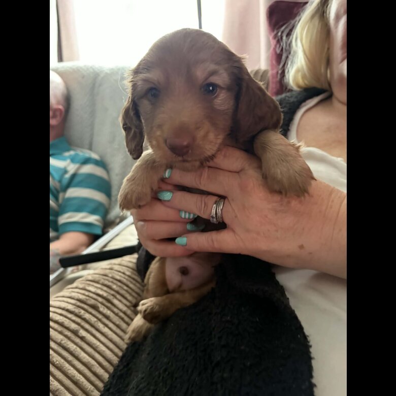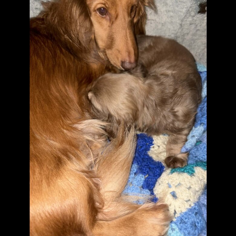 Long haired daschund mum is golden brown dad is a miniature dapple long haired .pup will be wormed and flead chipped and first injection.