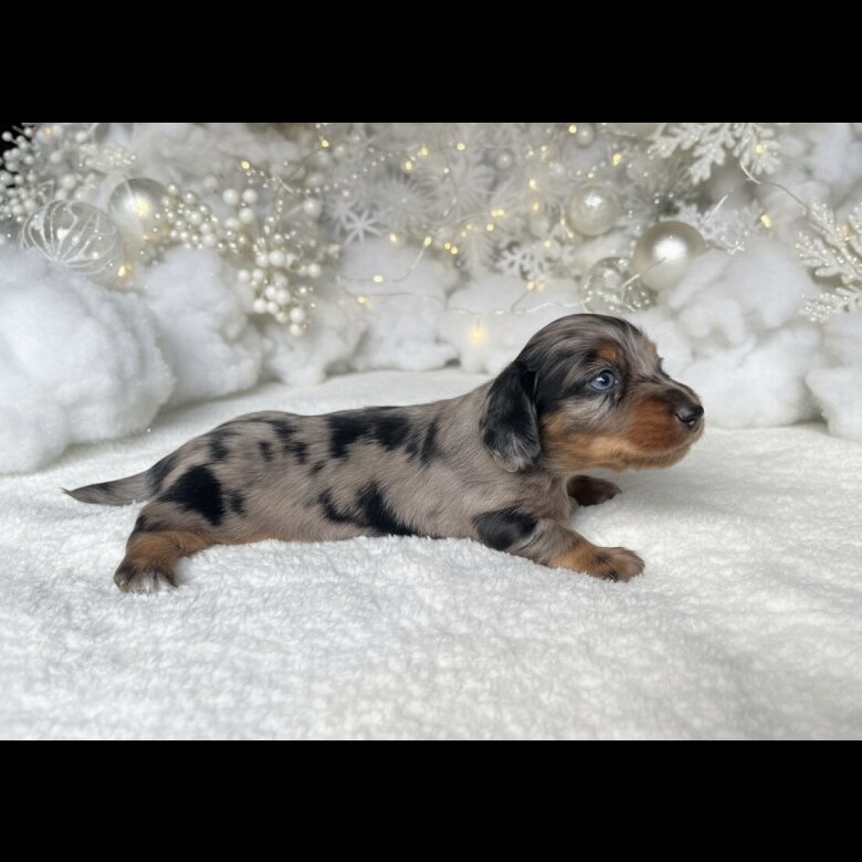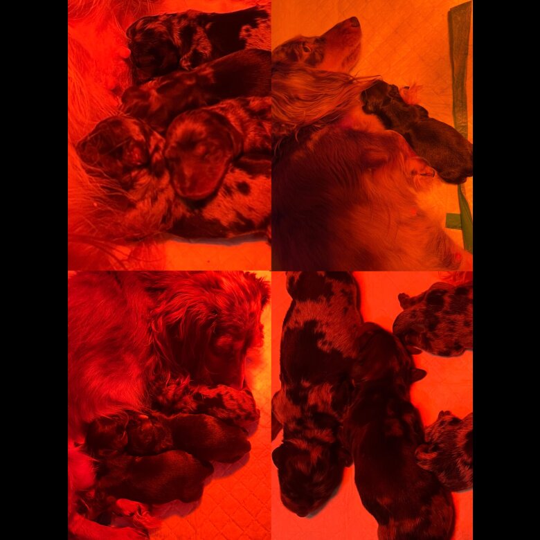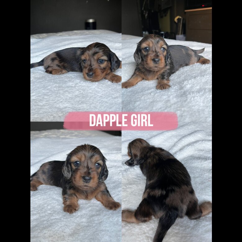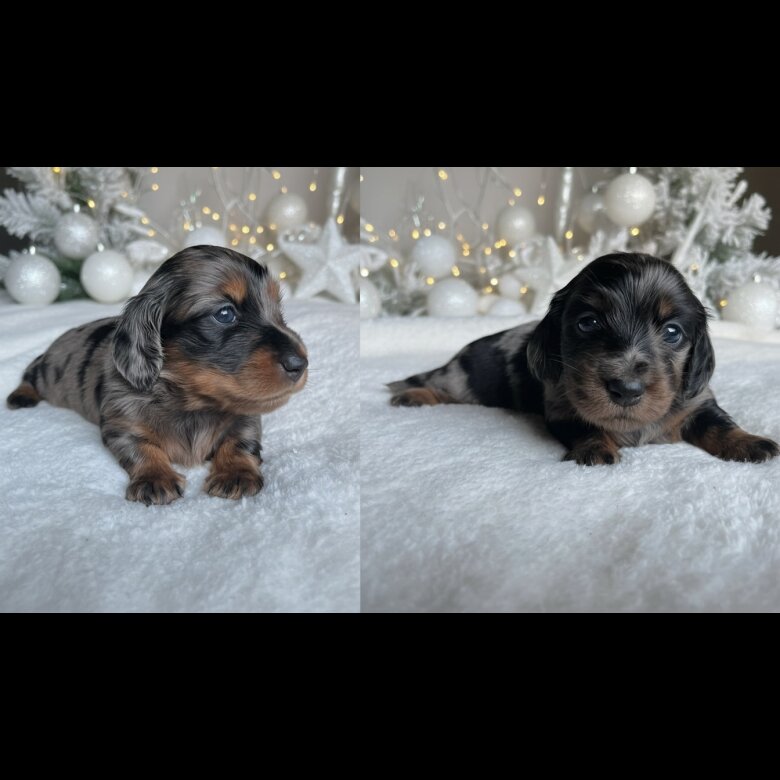 Champion bloodline dapple and solid colour miniature long haired dachshund puppies. Health tested and KC Registered These beautiful happy,healthy babies are raised in our home. We are completely devoted to our Dachshunds, They’re handled daily, well socialised, and exposed to everyday busy household sounds and experiences. We own both mum and dad who are both perfect examples of the breed with numerous show champion/Russian show champion bloodlines behind them. Both have excellent temperaments, gentle loving and affectionate. Parents and grandparents are DNA Genetically tested Progressive Retinal Atrophy (PRA) Cord1 - PRA (Cone-rod dystrophy 1) BVA eye tested All puppies will leave with two extensive vet health checks, 1st vaccination, microchipped, wormed upto date, Puppy packs with toys, accessories and food to leave with. Our puppies are family for life, we would hope it never happens but If ever an owner faced unexpected circumstances, we would always gladly take back any puppy/dog we have bred. We would never want our pups unsettled passed from home to home. Please feel free to get in touch if you would like any more information and to arrange a viewing of these Gorgeous puppies. Updates and videos of their growth and daily playtimes will constantly be sent to new families until collection! Due to the terrible rise in scams involving false puppy adverts and upfront deposits, we don’t ask for a deposit before people visit. We recommend potential new owners come view our puppies early in person to choose from and then leave a deposit until collection