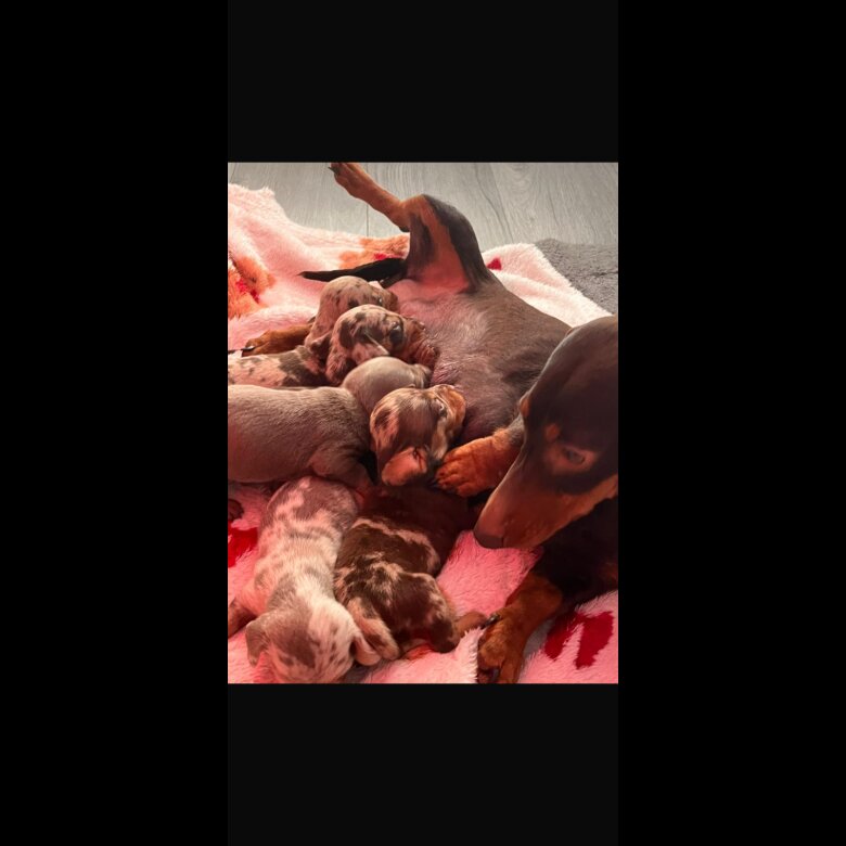 Miniature dachshunds litter of 7 healthy puppies Mom is chocolate tan short haired Dad is white dapple piebald long haired Both parents are upto date with health checks and vaccinations Mom can be seen with her puppies Photo of dad can be provided We have 1 chocolate tan girl 2 Isabella girls 3 dapple boys 1 dapple girl Each puppie will be vet checked and microchipped and upto date with vaccinations , they will also be upto date with deworming treatment. They will be ready to leave for there forever homes on 13th may 2026 at 8 weeks old, they were born on 18th march 2026 Weekly updates will be provided with photos /videos or home visits are welcome to be arranged £1500each £500 non refundable deposit to secure sale.