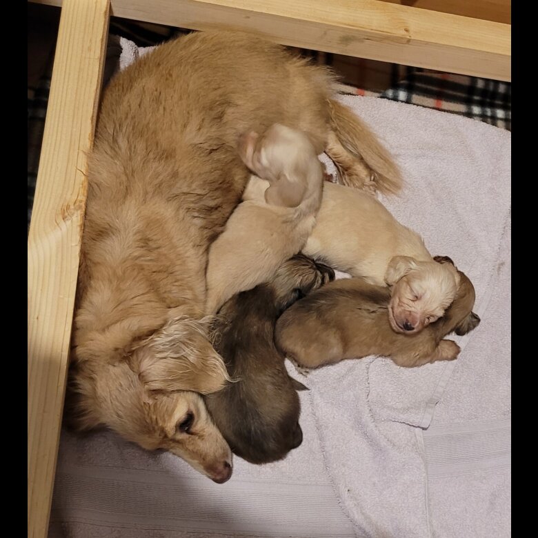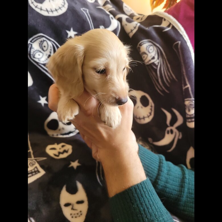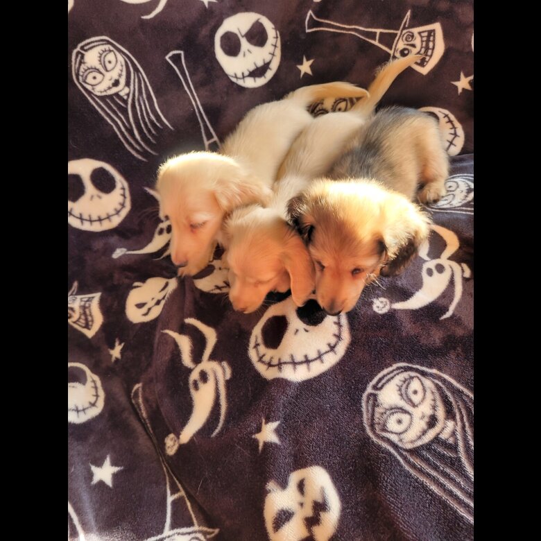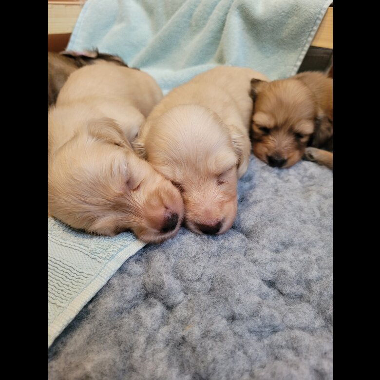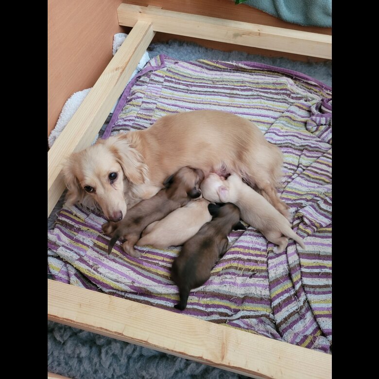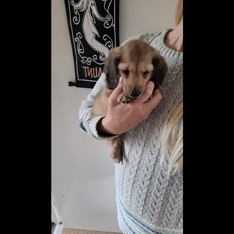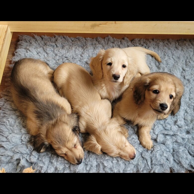 We have a beautiful litter of 4 long haired cream dachshunds born on 31st August 2025. They have been lovingly reared in a home environment with no expense spared. They are happy, confident and playful little sausages that have been socialised with my children and my family dogs - which includes my original old shaded red dachshund girl who is grandmother to this litter and also our old lady labrador and my very ancient cat. They are used to everyday noises - hoover, washing machine and noisy children. They are used to regular interactions with me and my children and enjoy cuddles and play time. Both parents are calm and loving sausages. Mum loves nothing more to curl up in a lap. Both parents have been DNA tested for & are clear of PRA (cord 1). The sire has been screened for BVA. Both parents are fairly small and under the 5kg weight for minis - Mum is 3.8 kg and dad is 4.3kg. The puppies will be available to go to their new homes from 13th November. They will go with KC registration and 5 gen pedigree certificate, and puppy pack which will include a blanket that smells of mum and the other puppies, 2 weeks of their current food and few little home comforts. They will be fully vaccinated, treated for parasites, microchipped, and checked over by a vet to ensure they are healthy and ready to go to their new homes. Please contact me if you would like to view, have any questions or would like any more photos.