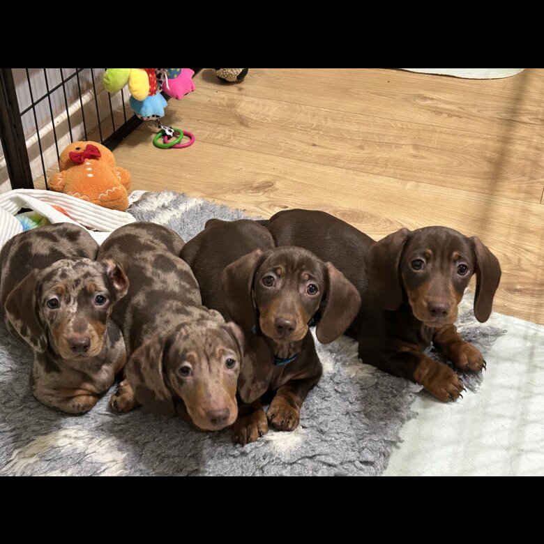 ✨ Stunning Miniature Dachshund Puppies – Ready Now ✨ We are delighted to introduce our gorgeous litter of Miniature Dachshund puppies, with two beautiful boys available — two rich chocolate & tan. These little characters are ready to leave for their forever homes now. Raised in our loving family home, the puppies are well socialised with both adults and children, confident, playful, and full of personality — the perfect start to a happy life. They have all received a full veterinary health check, with a clean bill of health, and are microchipped for peace of mind. First vaccination completed. Each puppy will go to their new home with: 🦴 A supply of their current food 🧸 A toy with familiar scents 📘 Plenty of helpful puppy advice to support their transition Mum is a stunning Isabella dapple with a calm, affectionate nature and is excellent with children. Dad is KC registered and an impressive 27-times champion, bringing outstanding quality and temperament. These puppies are expected to grow into loving, loyal, and devoted companions, perfect for families or individuals looking for a special addition to their home. 📩 — please get in touch to learn more or arrange a viewing.