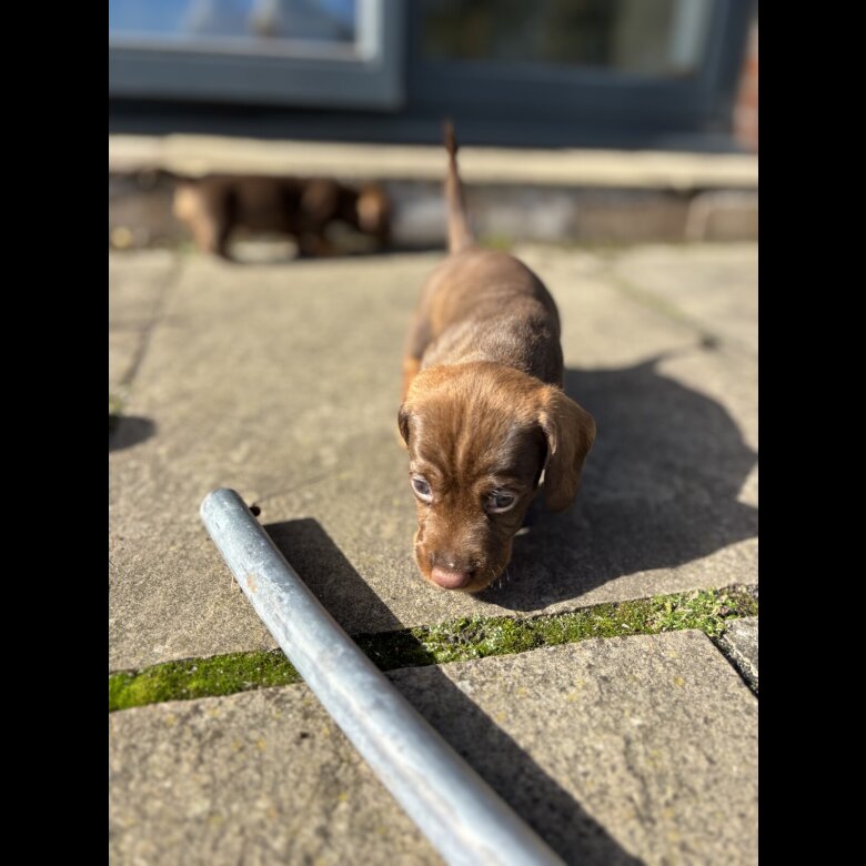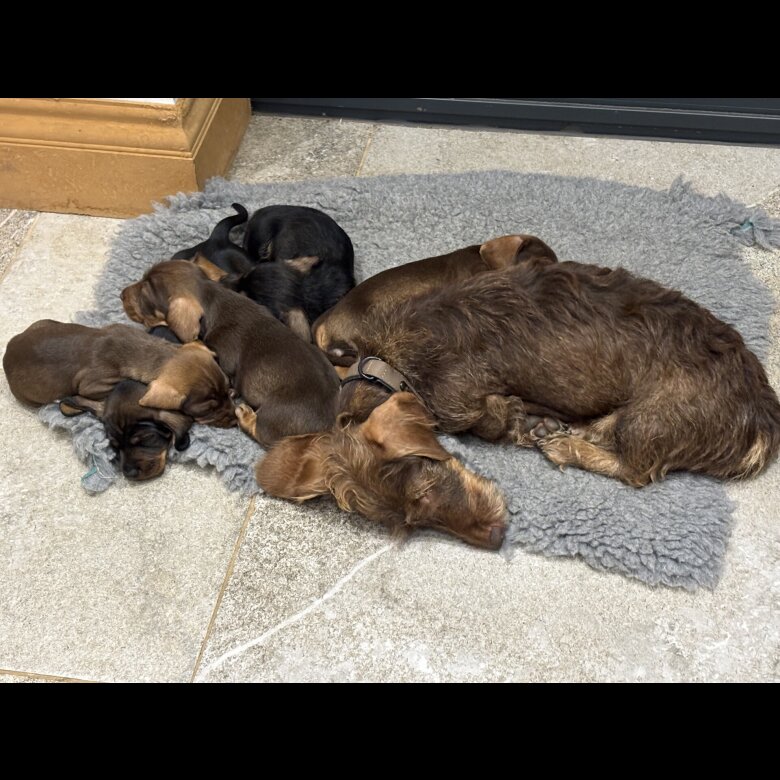 4 girls left, 3 chocolate, 1 wild boar. Both parents are wire haired the pups have varied hair texture. Ready to leave 1st November.