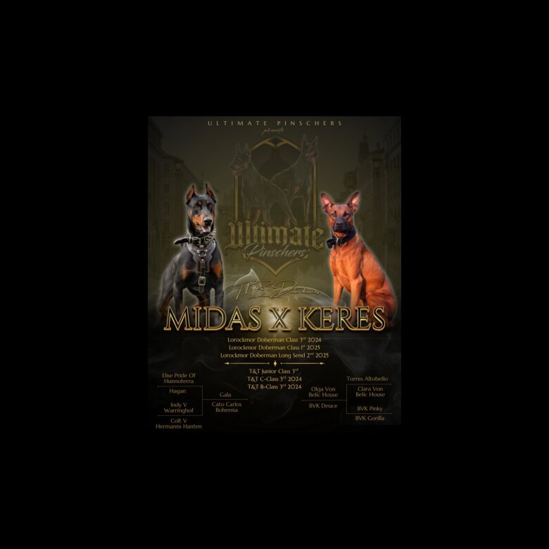 F1b Dobermann We are proud to announce the birth of 10 F1b Working Dobermann puppies from proven/titled bloodlines and are now taking reservations for a spot on this breeding. These puppies will only be sold to Working/Active pet homes. F1b means we are back crossing to a dobermann so these puppies will be 75% Dobermann 25% Bandogge Instagram ULTIMATE_PINCHERS All of these puppies will come with lifetime support from me. All the puppies from the litter will be getting daily exposure to different stimuli and environments, getting them ready for the real world, exposing them to loud noises, children, people, dogs, cats, car journeys, walking on leads, house training and they will also be going to a couple of puppy therapy days, where they will get lots of interaction from different people and children. If you would like to see pictures/videos of Keres and my other personal dogs my Instagram page. There is also a section in my highlights called pups where you can see how I raised my last litter and all I did with them, being a breeder is not my job I have a love for dobermanns and dogs in general so I am doing this breeding so that I can keep one for my programme. I prefer to not be a full time breeder as I feel by having just the odd litter here and there then I am able to put 100% of my time,effort and love into them. The dam is my own personal dog called Keres. She is not only my pet but she is also worked in protection, high level obedience and competes in multiple trials around the UK. She has placed top 3 multiple times against some of the best working dogs in the uk. She is 50% Dobermann & 50% Bandogge. She is a very easy dog to own, eager to learn, social towards people and good with dogs and other animals if introduced correctly, very calm and easy in the house with a very nice off switch. Dont let that fool you because with one word you can switch the dog into drive and when it comes to training she is a very driven and energetic dog so you will only get to experience and enjoy the nice peaceful side of her once all her physical/mental stimulation needs are met. 3rd place T&T Junior class 2023 3rd place T&T C class 2024 3rd place T&T B class 2024 Her dam is Olga Von Belić house, she is a European Dobermann with a blood line full of show/working titled dogs. Her sire is a dog called BVK Duece. He is a Bandogge and is very well known in the working dog community. He has proven himself multiple times in UK trials bringing home multiple achievements as follows: 2nd place AVD Long send (11months) 1st place AVD Long send 1st place AVD long send 3rd place AVD long send 2nd place ACA long send 1st place AVD silver 1st place AVD silver 1st place AVD anniversary suit 1st place Fright Night suit class 1st place Trials and Tribulations B Class The Sire to this litter is a dog called Midas who is a pure Dobermann. Who also is worked and competes in trials in the UK. He is a very good example of what a Dobermann should be, elegant, powerful and athletic. He is a very confident and driven dog. With a very strong bloodline behind him. Social towards people/dogs if introduced correctly. 1st place Lorockmo 2025 Dobermann Class 2nd place Lorockmo 2025 Dobermann long send 3rd place Lorockmo 2024 Dobermann Class His sire is a dog called Cato Carlos Bohemia an ipo3 titled dog with a lineage full of ipo2/3 titled dogs. His dam is Patryk Black Beauty Lady who is a direct offspring from Elise Pride of Hunnoterra & Yanez Di Altobello (Hagan) who is the ONE AND ONLY Dobermann to ever win a AVD GOLD CLASS. If you have any questions or want to enquire please feel free to contact me. Pictures/videos of both dam/sire are available on request. I am only opening up 6 spots for reservation. 3 males 3 females 1st male ❌ 2nd male ❌ 3rd male❌ 4th male❌ 5th male✅ 6th male ✅ 1st female❌ 2nd female❌ 3rd female ✅ 4th female ✅