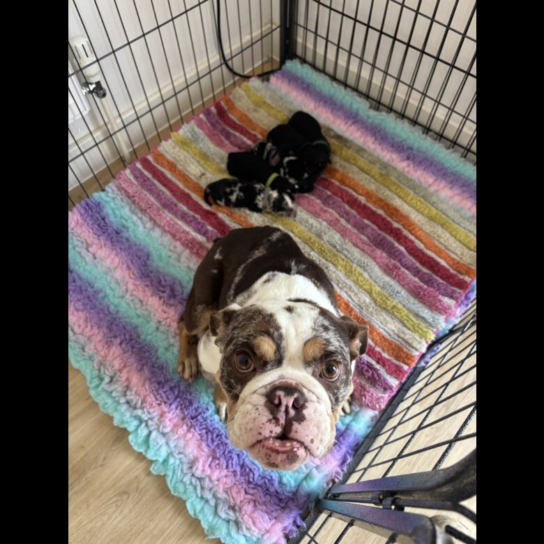 We have 3 girls and 2 boys available. Mum is KC registered, this is her first litter, and she has been an amazing, gentle mother. Dad is a beautiful old English Bulldog.The puppies are being raised right in our living room, surrounded by all the sights and sounds of family life, as well as being well-socialized with our cats. They are given plenty of love and care every day to ensure they grow up confident, playful, and happy.