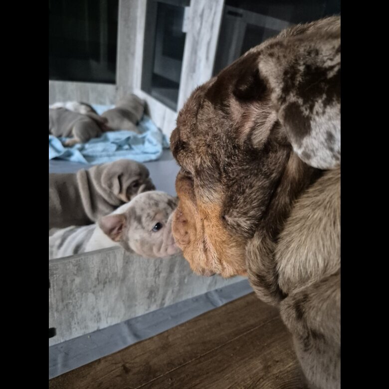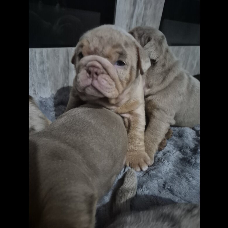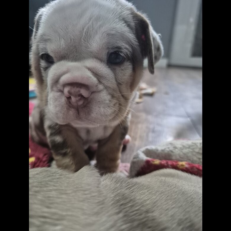 Arry Our Boy, The Father Of The Pups Who Is A English Chocolate Merle Bulldog. Son Of Broski (Supreme Bloodlines Scotland) x Peggy (Doxies Bullies) Orbit Son & Nemesis Daughter.