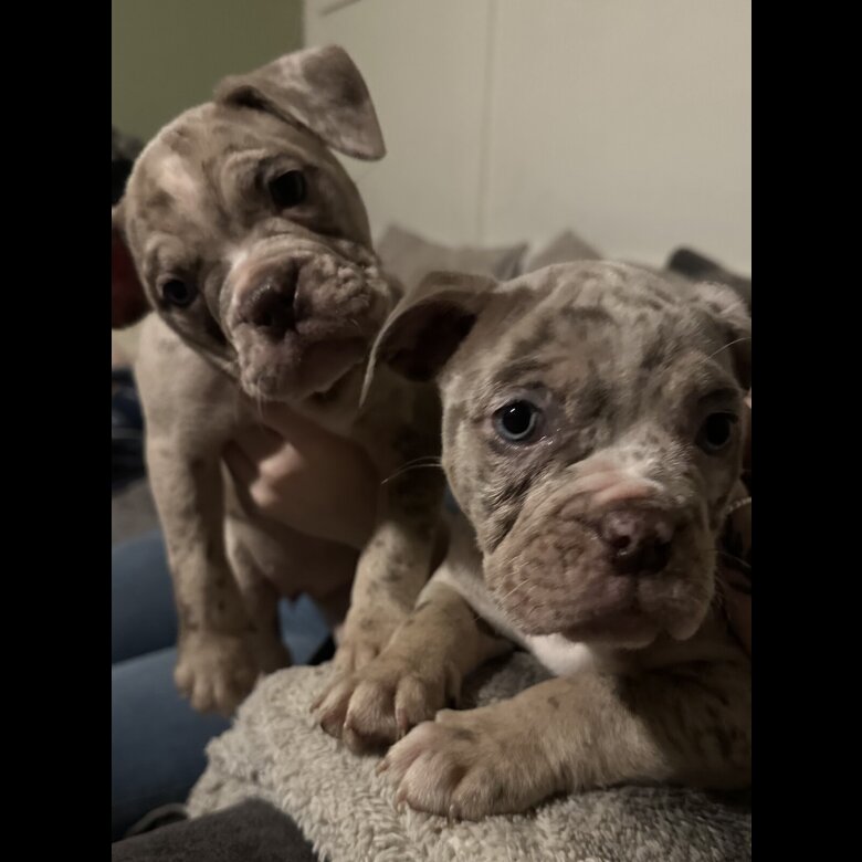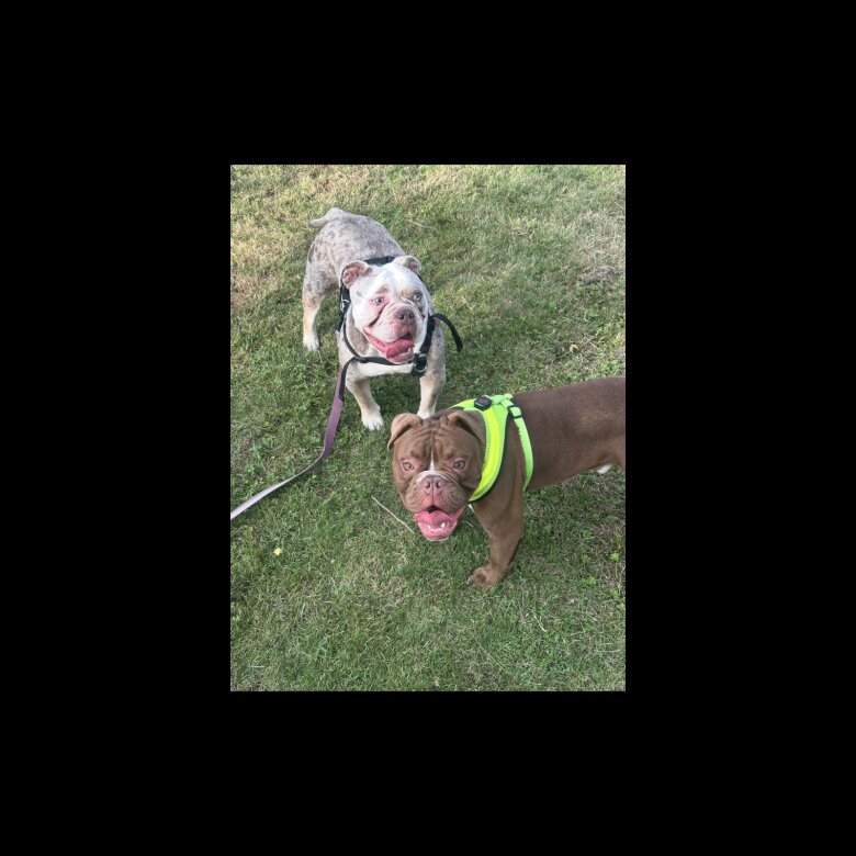 We are delighted to introduce our first litter of pure Old Tyme Bulldogs — 2 boys and 5 girls. Both parents are our much-loved family pets and can be seen with the puppies. They are both **** registered and in excellent health with no known health issues. Both parents are in with the photos. This beautiful litter includes some rare and stunning colours: • 1 fawn female • 2 lilac merle females • 1 chocolate female • 1 chocolate male • 1 lilac and tan male • 1 tri merle female All puppies have blue eyes apart from the chocolate coloured ones. All puppies have been raised in a busy family home alongside their parents, our children, cats, and another family dog, with plenty of visitors. This has helped them become very well socialised and confident. I have tried my best to get you some good pictures but my phone camera isn’t the best and they never stay still long enough to get ones that aren’t blurry 🙂 Before leaving for their new homes, each puppy will come with: • Microchip • First vaccination • Flea treatment • Worming treatment These puppies have truly had the very best start in life. They are healthy, happy, and full of energy. From birth they have been handled daily and absolutely love human attention. They enjoy playing with the other dogs in the house, have been introduced to our cats, and spend lots of time playing with our children. They are also well accustomed to normal household noises. They are deeply loved members of our home, so it will be very sad to see them go. We are committed to finding the very best forever homes for them. Before enquiring, please make sure you have researched the Old Tyme Bulldog breed and checked suitable pet insurance options, as responsible ownership is very important to us.