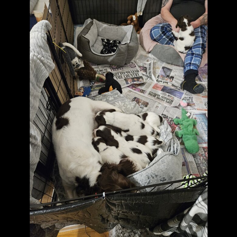 They are springer spaniels liver and white . Boys and girls ready for homing from next weekend . Tails been docked and been micro chipped by vet . They haven't got papers but are pure breed spaniels mother has excellent pedigree she has papers which can be seen father is off working stock he has no papers so we are asking ,£600