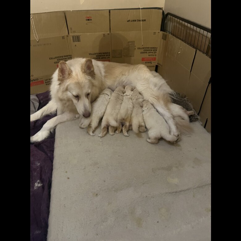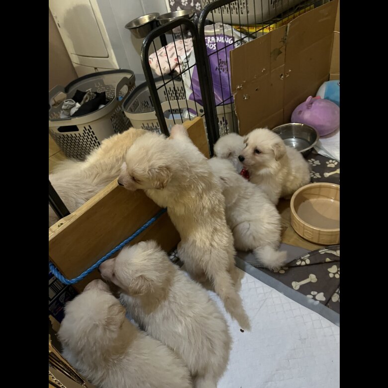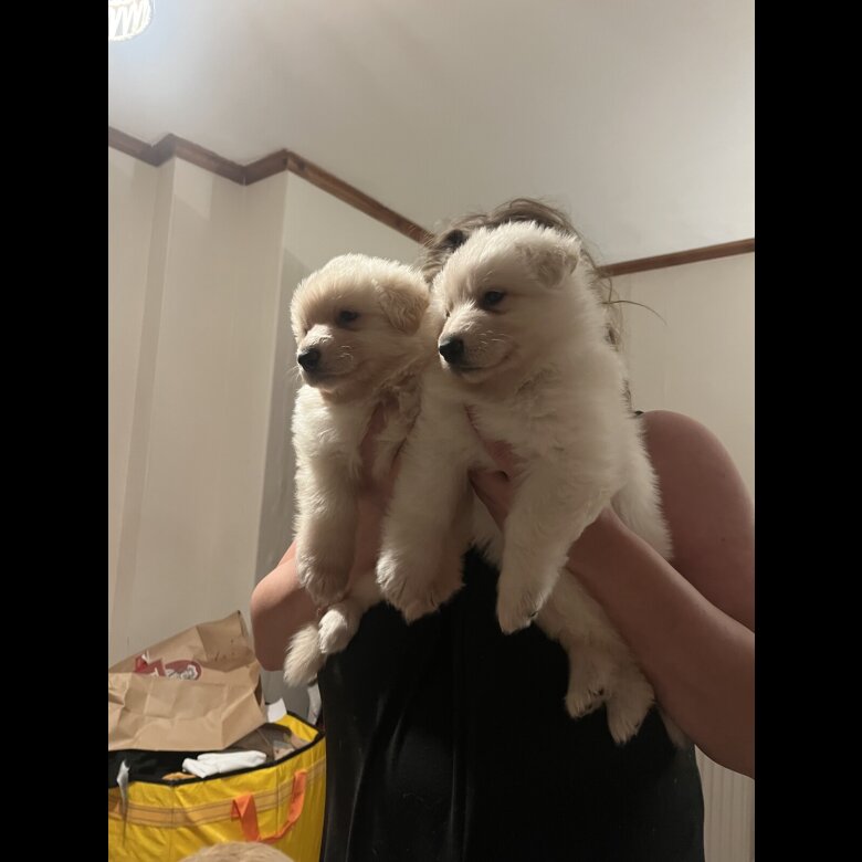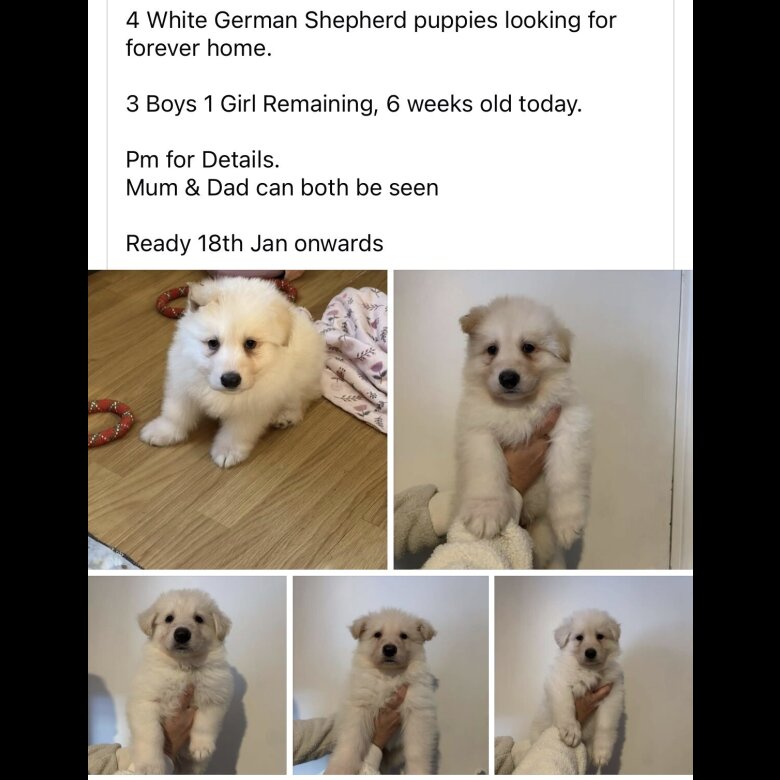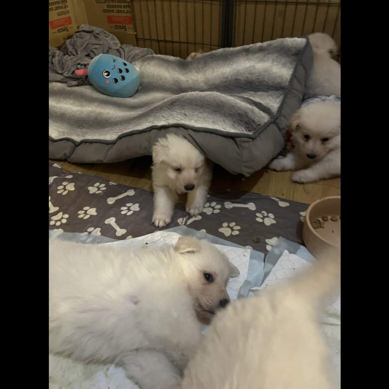 4 white German shepherd puppies looking for forever home 3 boys 1 girl microchipped and had first vaccinations and wormer