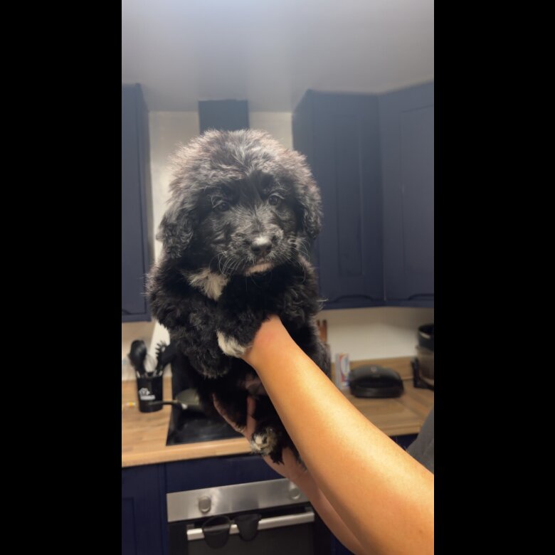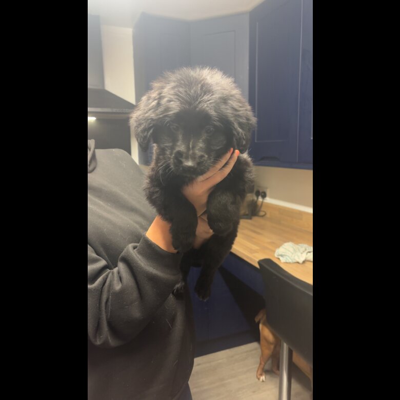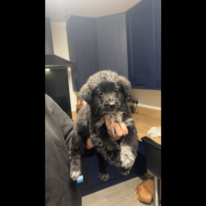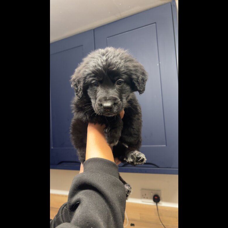 Beautiful black & white puppies available from a German Shepherd mum and Cocker Spaniel dad. Fluffy coats with lovely white markings, bright eyes and gentle temperaments. Raised with regular handling and already showing curious, clever little personalities already going outside for poos and wees if door open