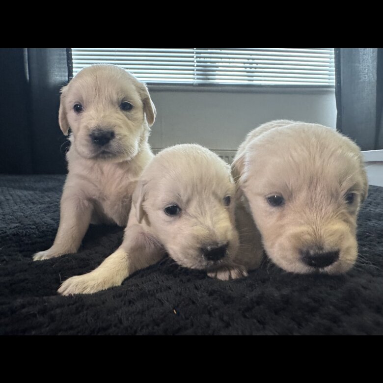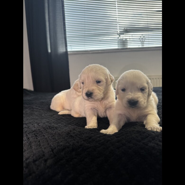 3 beautiful Golden Retriver Puppy’s 2 boys 1 girl they are white/ light gold coated. They will be wormed, fleas, microchipped and first vaccine before collection. They are viewable with mum. Viewings are more than welcome